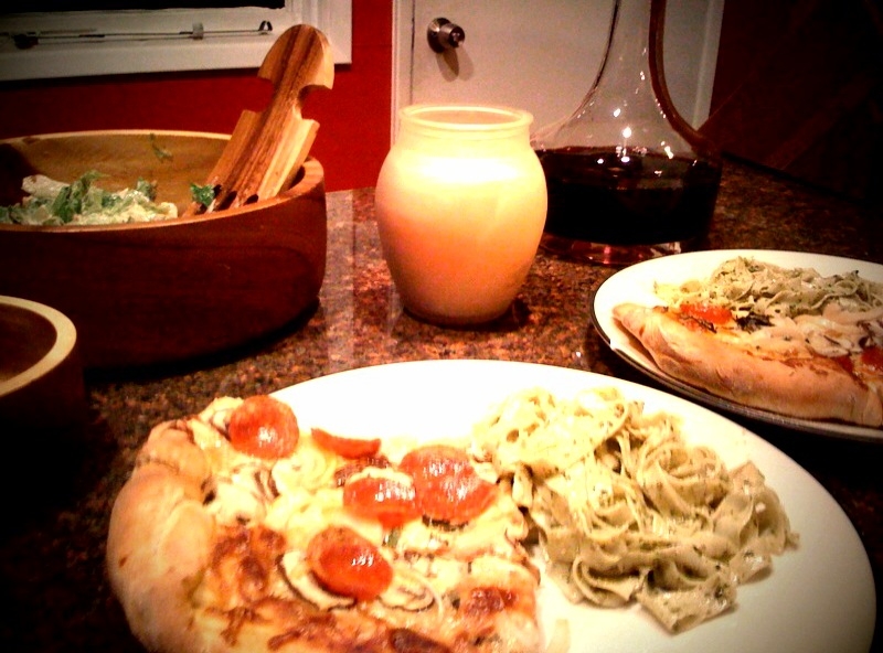 Last week my husband and I spent a wonderful evening celebrating our wedding anniversary! I decided to utilize the new skills that I learned at Central Market’s “Italian Fresh Pasta” class, and make some Pasta with Pesto and homemade pizza. Unfortunately, I didn’t have the wonderful Kitchen Aid attachments that I used in the class, so my trusty hands and rolling pin were the tools I had to work with.