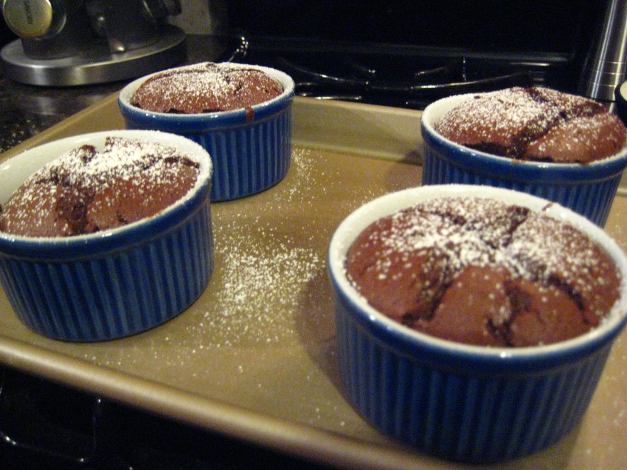 Now I went ahead and split the recipe in half for the Souffles (I didn’t need eight this time that’s for sure) so I just had one batch to work with. This time I chilled the bowl and the whisk and the egg whites turned out beautifully. There was no separation and they folded perfectly into the chocolate mixture. I made the mistake, yet again, of over cooking them just slightly, but even though they didn’t ooze chocolate, there were still creamy and delicious! I can’t wait to attempt a savory souffle for dinner next time! I just love to watch them rise in the oven!
