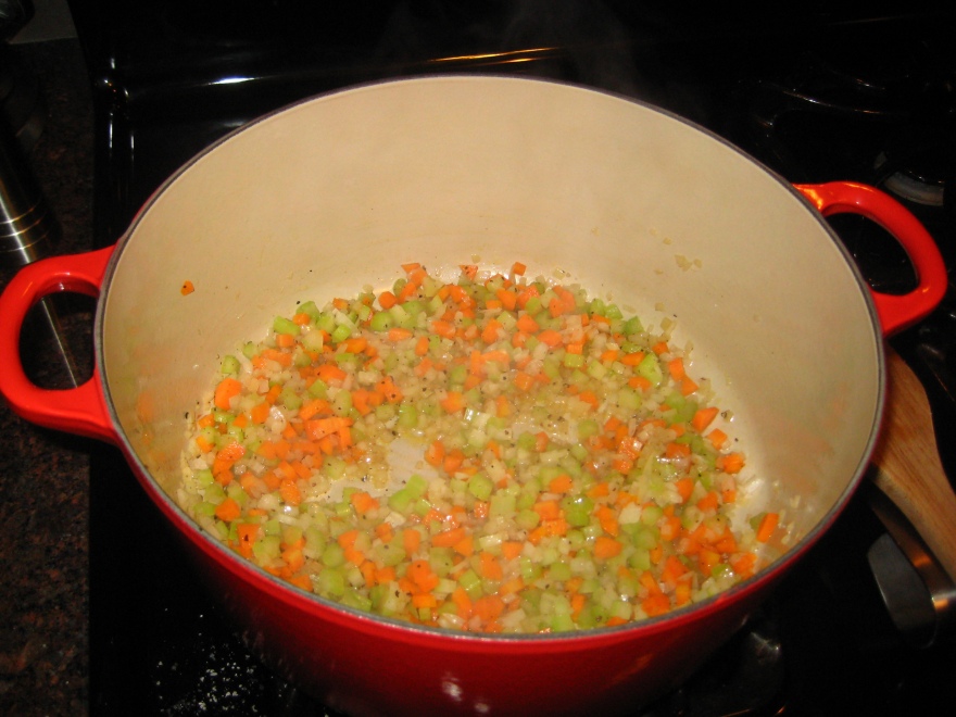 In the bacon fat saute the onion, carrot, and celery until slightly softened. Salt and pepper to taste. Add 2 garlic cloves and saute for 30 seconds. Add the wine and reduce until almost completely evaporated to about 1/4 cup.