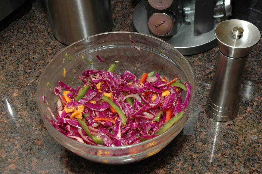 For the slaw, combine all of the ingredients through the lime in a large bowl. Stir until well combined and chill in the refrigerator while you assemble the rest of the ingredients. Stir in the cilantro right before serving.