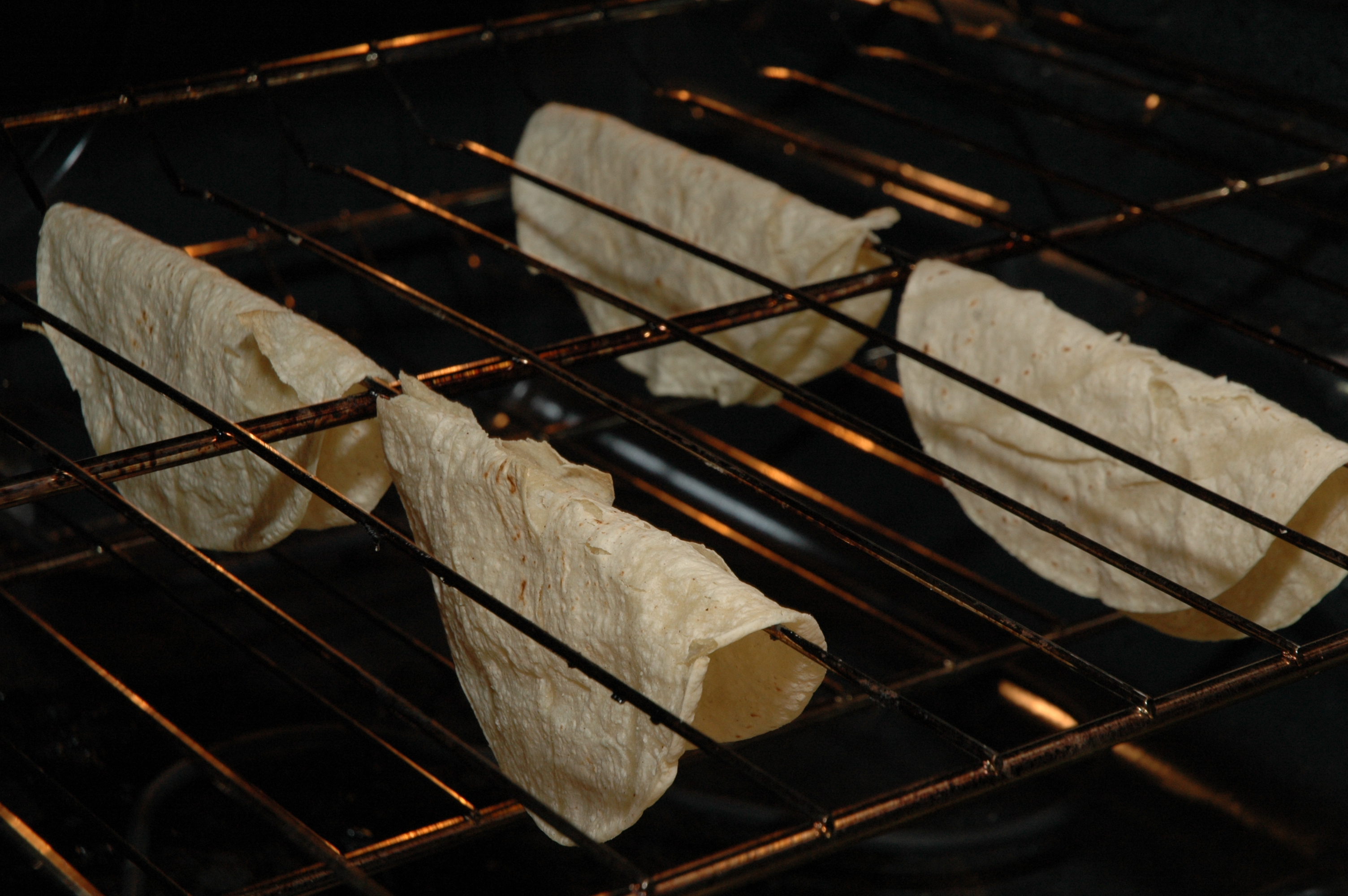 While the fish cooks place the corn tortillas carefully through the grates of the oven (upside down), making the shape of a taco. Bake until crisp, around 3-4 minutes. Remove with tongs and set aside.