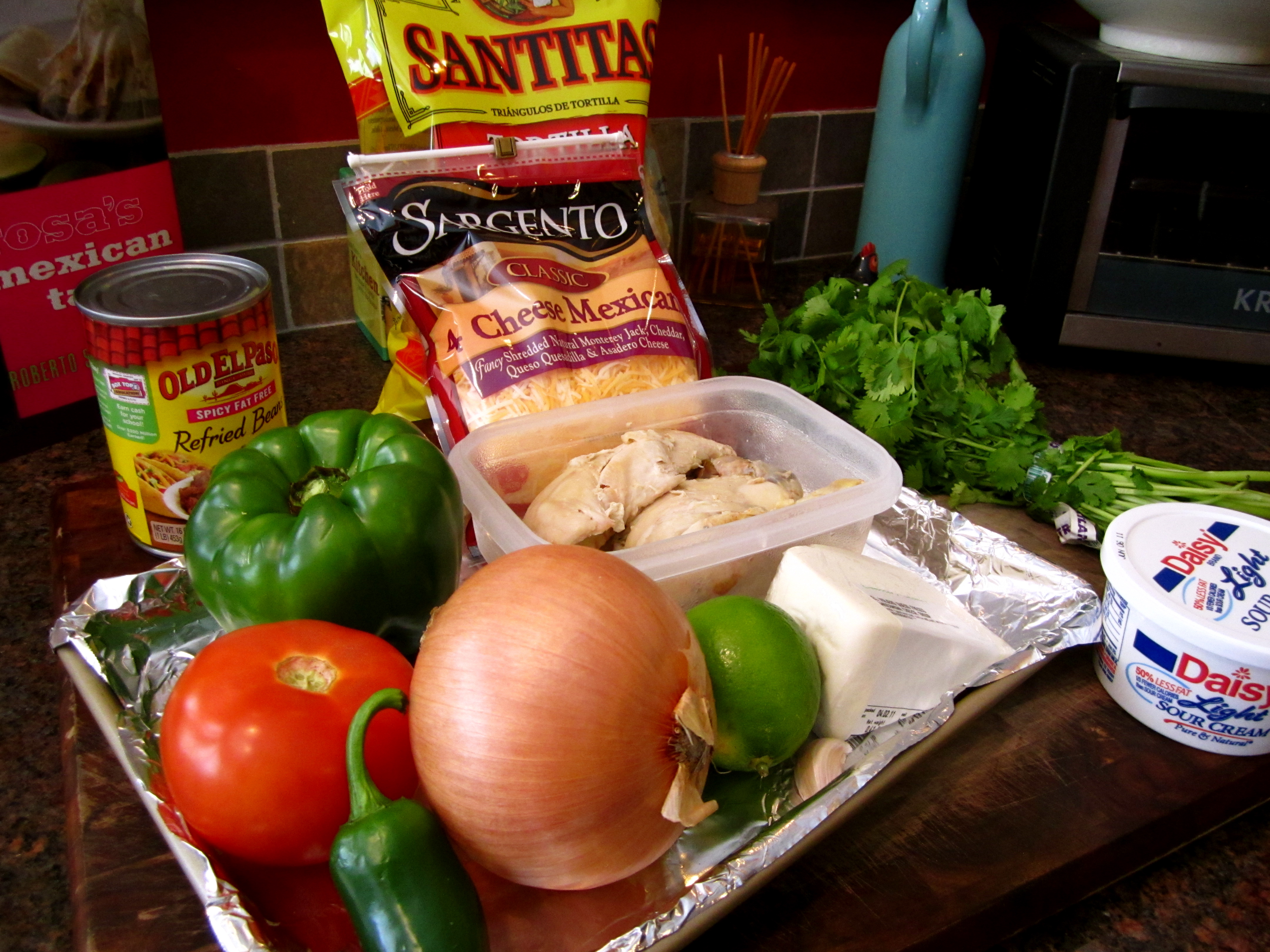 Remove from the oven and top with the beans, veggies, and chicken. Sprinkle with the cilantro, queso fresco, and tomato. Bake in the oven until all of the ingredients are heated through. Be careful not to bake too long; you don’t want to brown the chips. Remove from the oven and top with a few dollops of sour cream.
