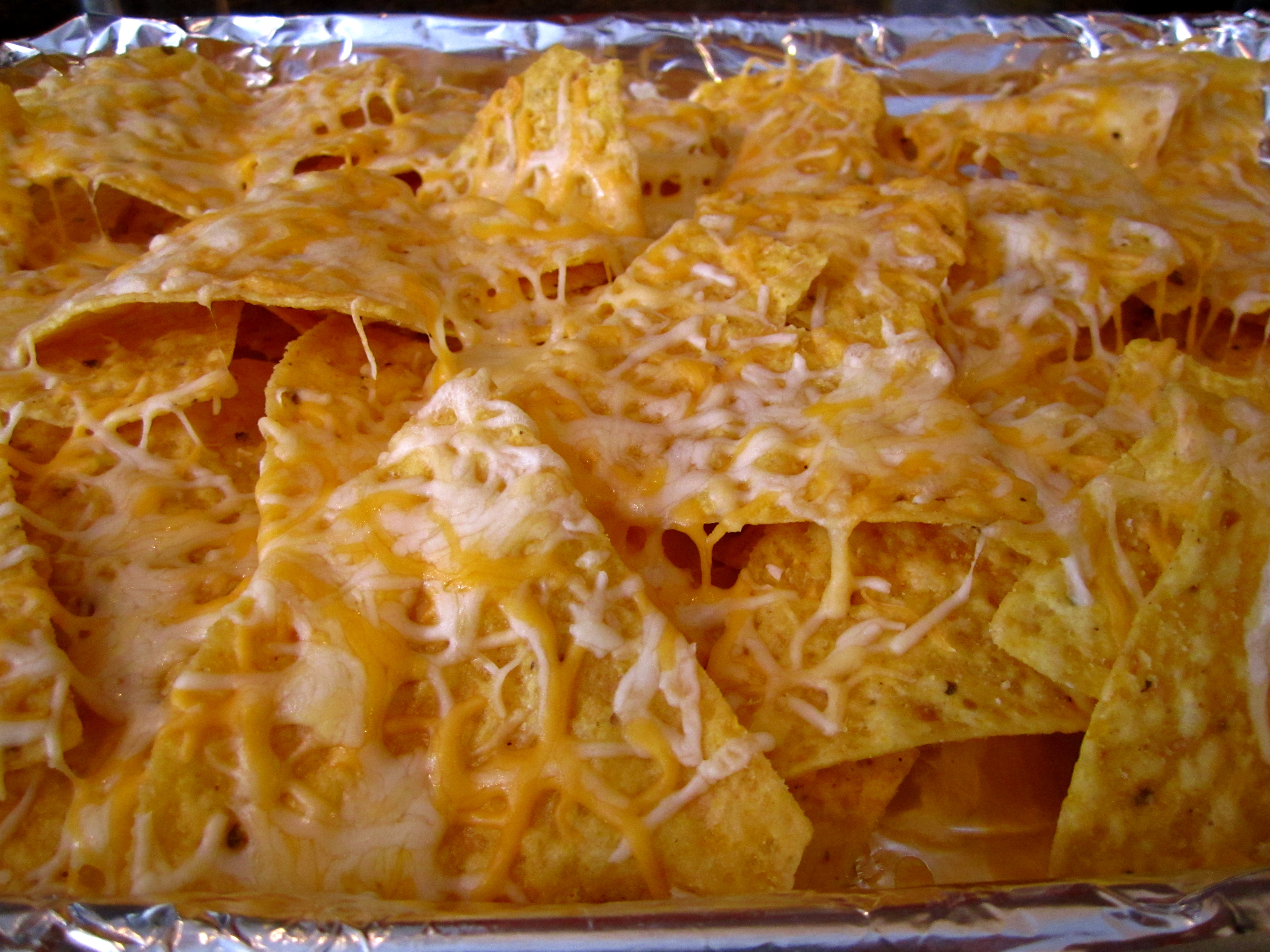 Using a foil-lined, quarter baking sheet (about ½ the size of a normal baking sheet), cover the sheet with a single layer of tortilla chips. Sprinkle with the 4 cheese blend and bake just until the cheese has melted.