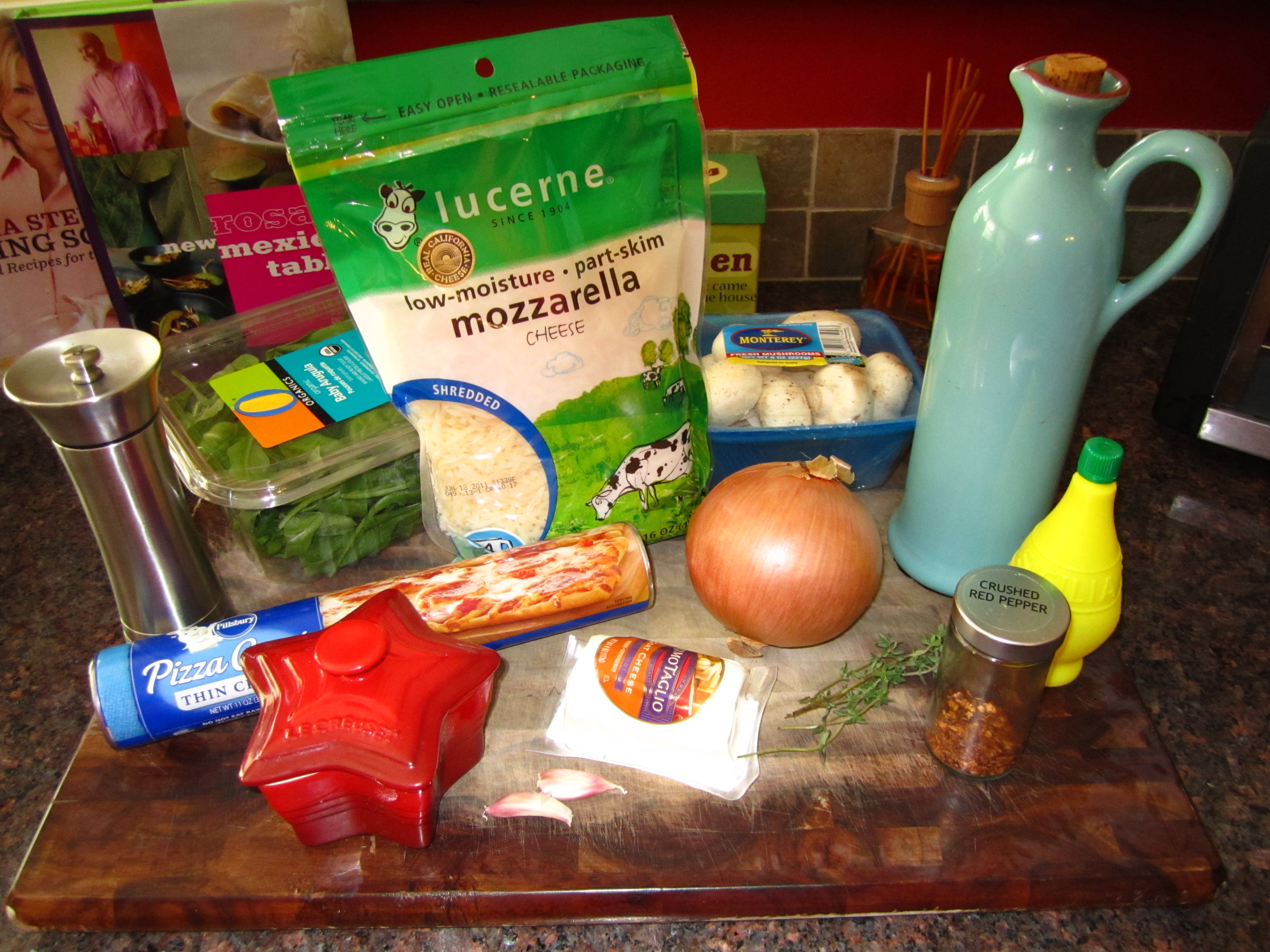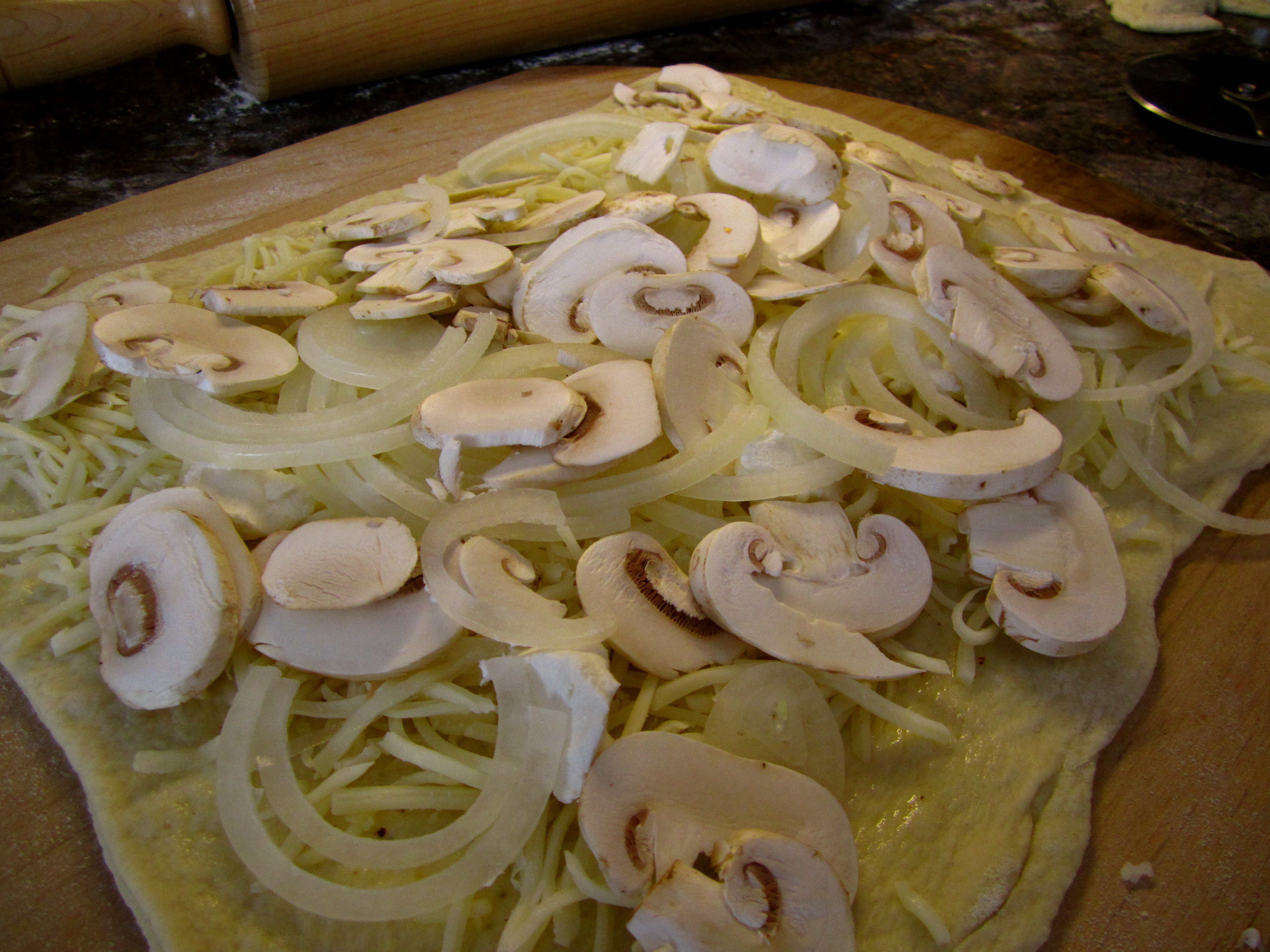 Top with the mozzarella, goat cheese, onions, and mushrooms.