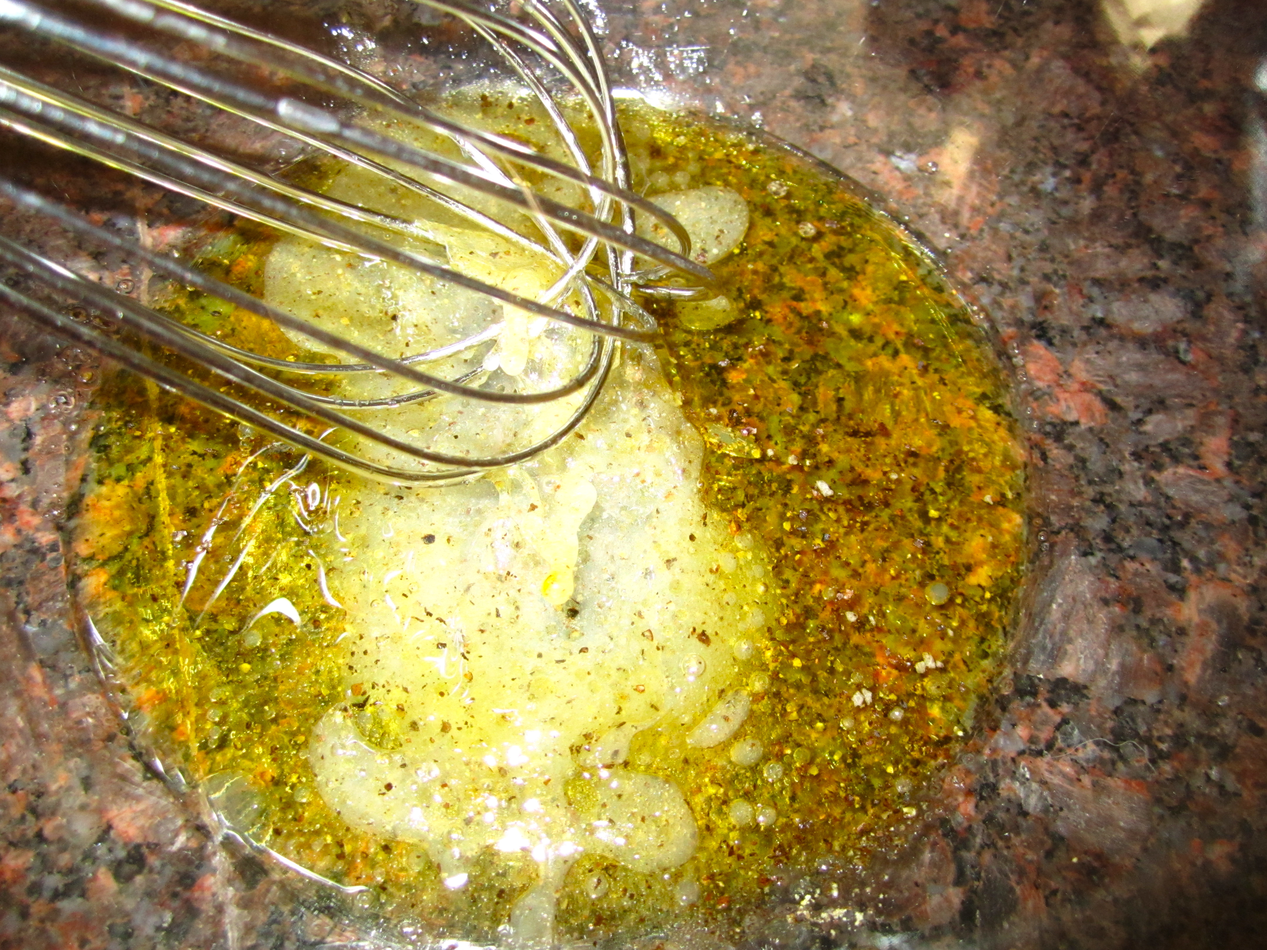 Combine the next 2 tbsp of olive oil, lemon juice, salt, and pepper in a large bowl and whisk until combined.