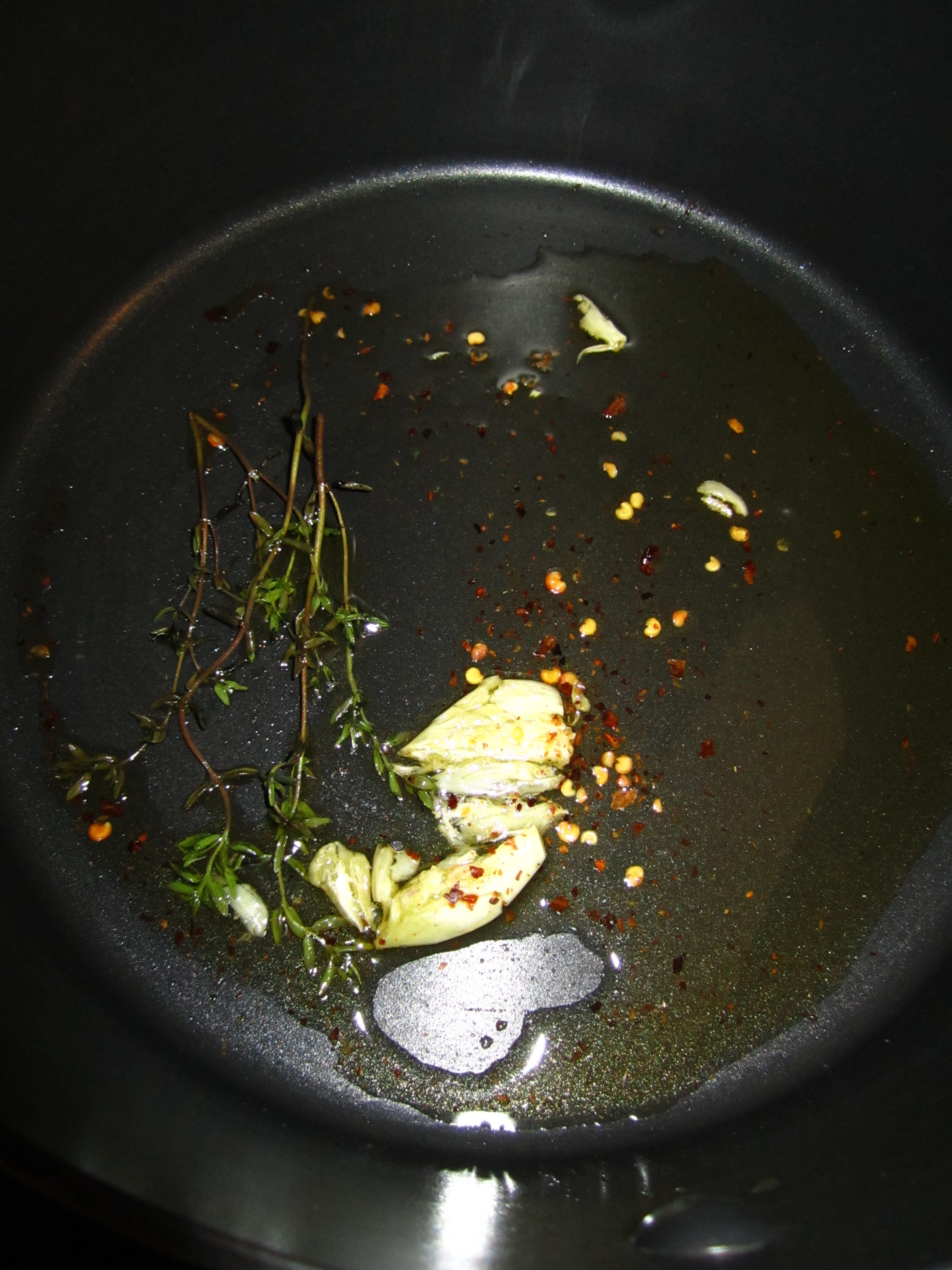 In a small sauce pan over medium-low heat, combine the olive oil and next 3 ingredients, through the red pepper. Heat until fragrant, set aside.