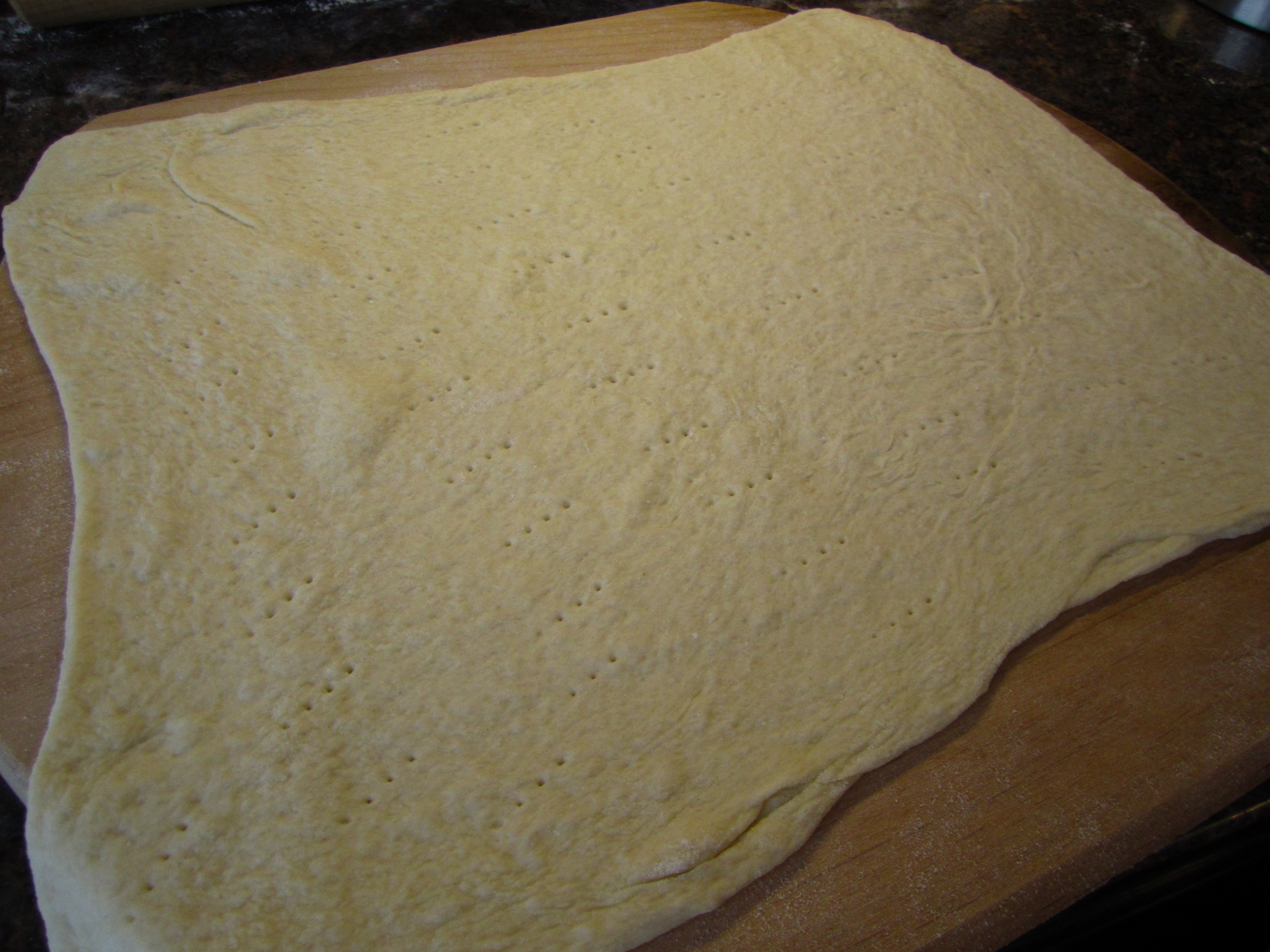 Lightly flour countertop and gently roll out the pizza crust. Fold in half and roll into a nice rectangle with a rolling pin (this helped the crust fit onto the stone better). Poke all over with a fork to prevent the crust from rising too much.