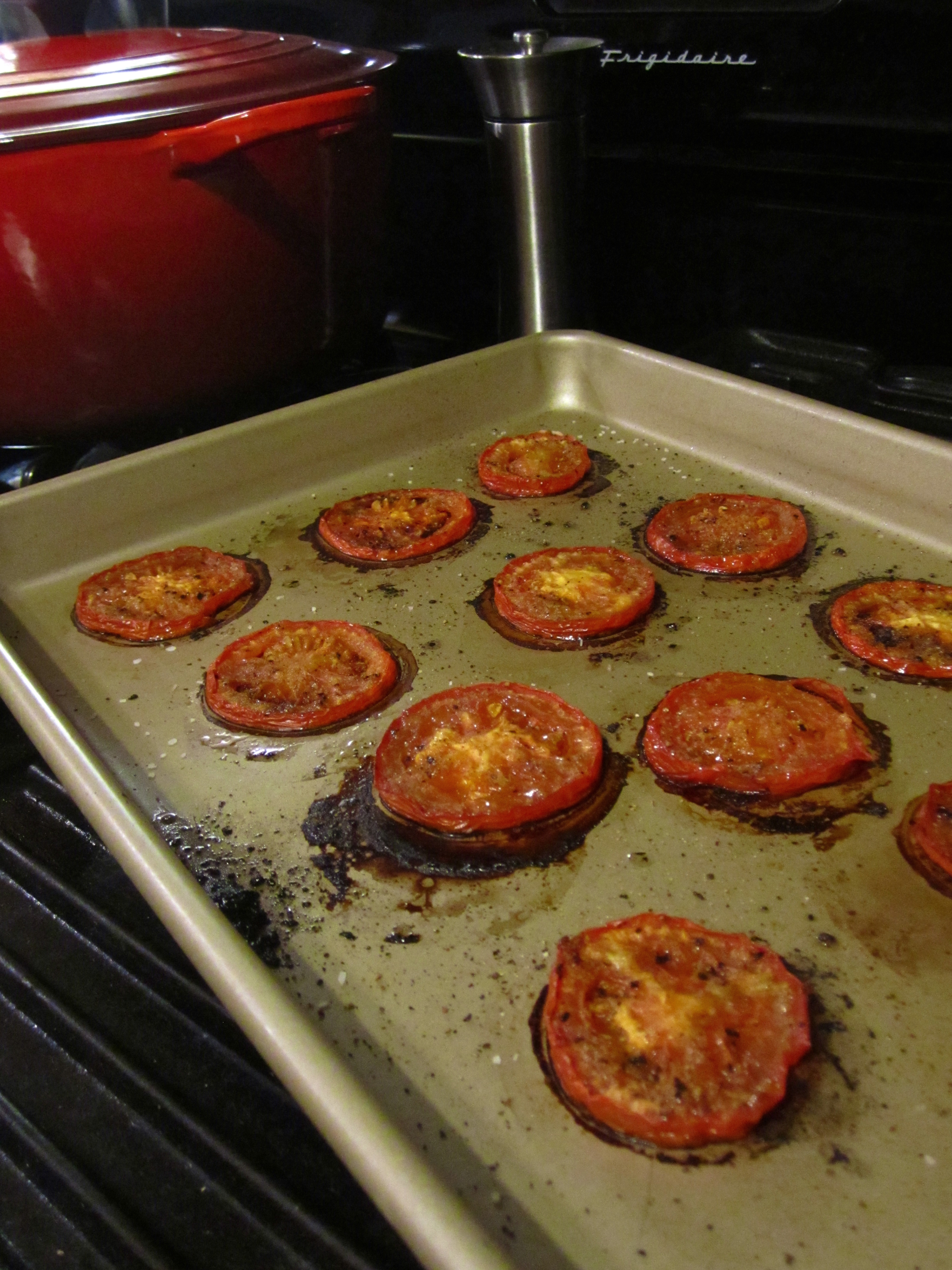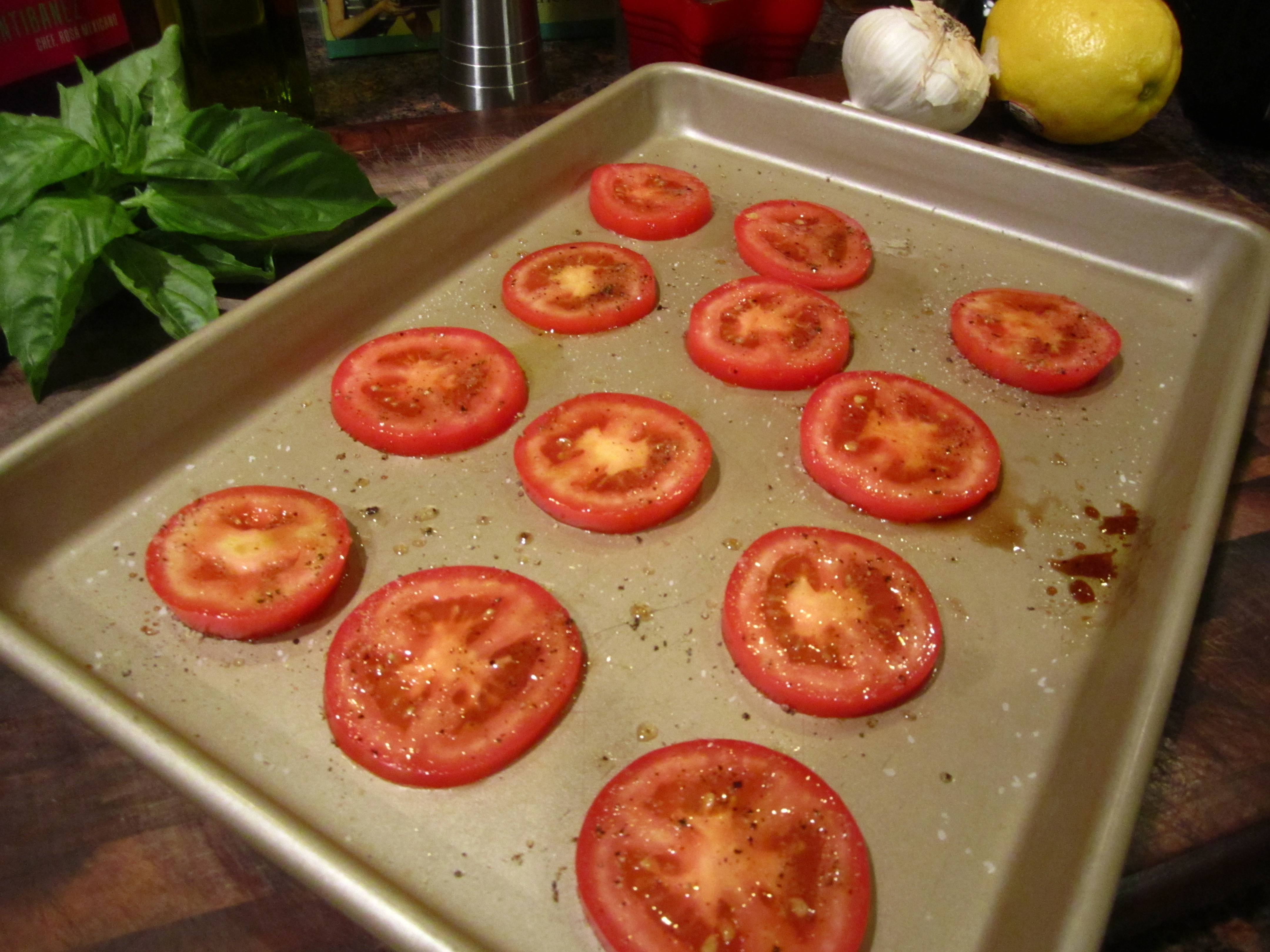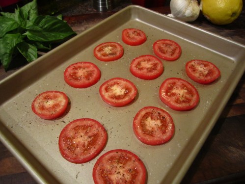 Place the tomato slices on a large baking sheet and dust with the garlic powder, salt, pepper, and sugar.