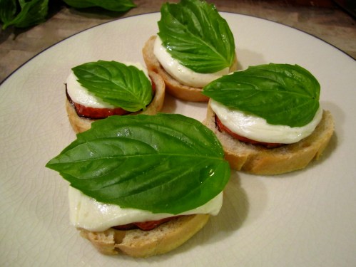 Bake in the oven until the cheese is slightly melted and shiny and the bread is crisp. Remove from the oven and top with one basil leaf apiece.