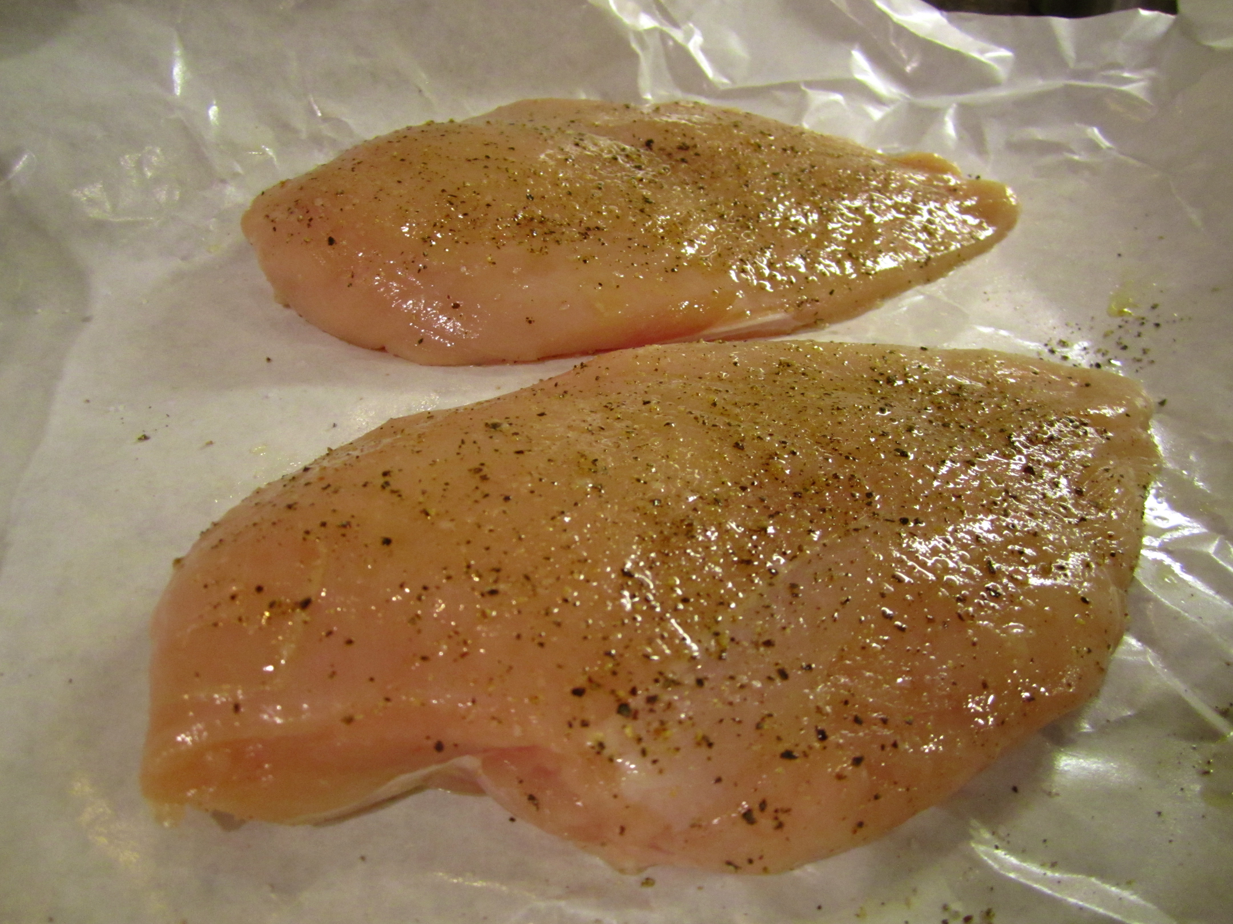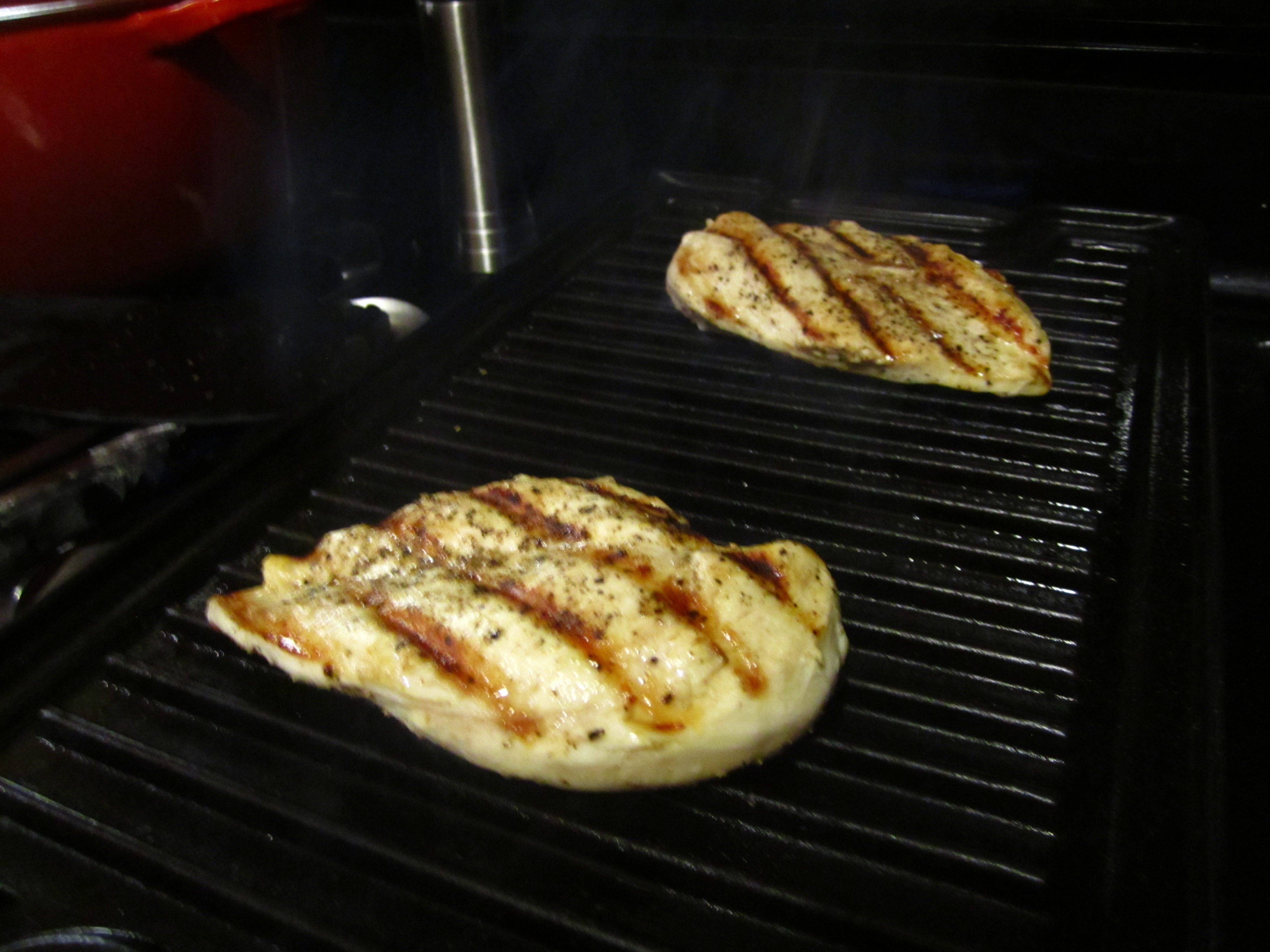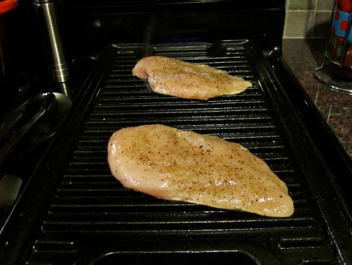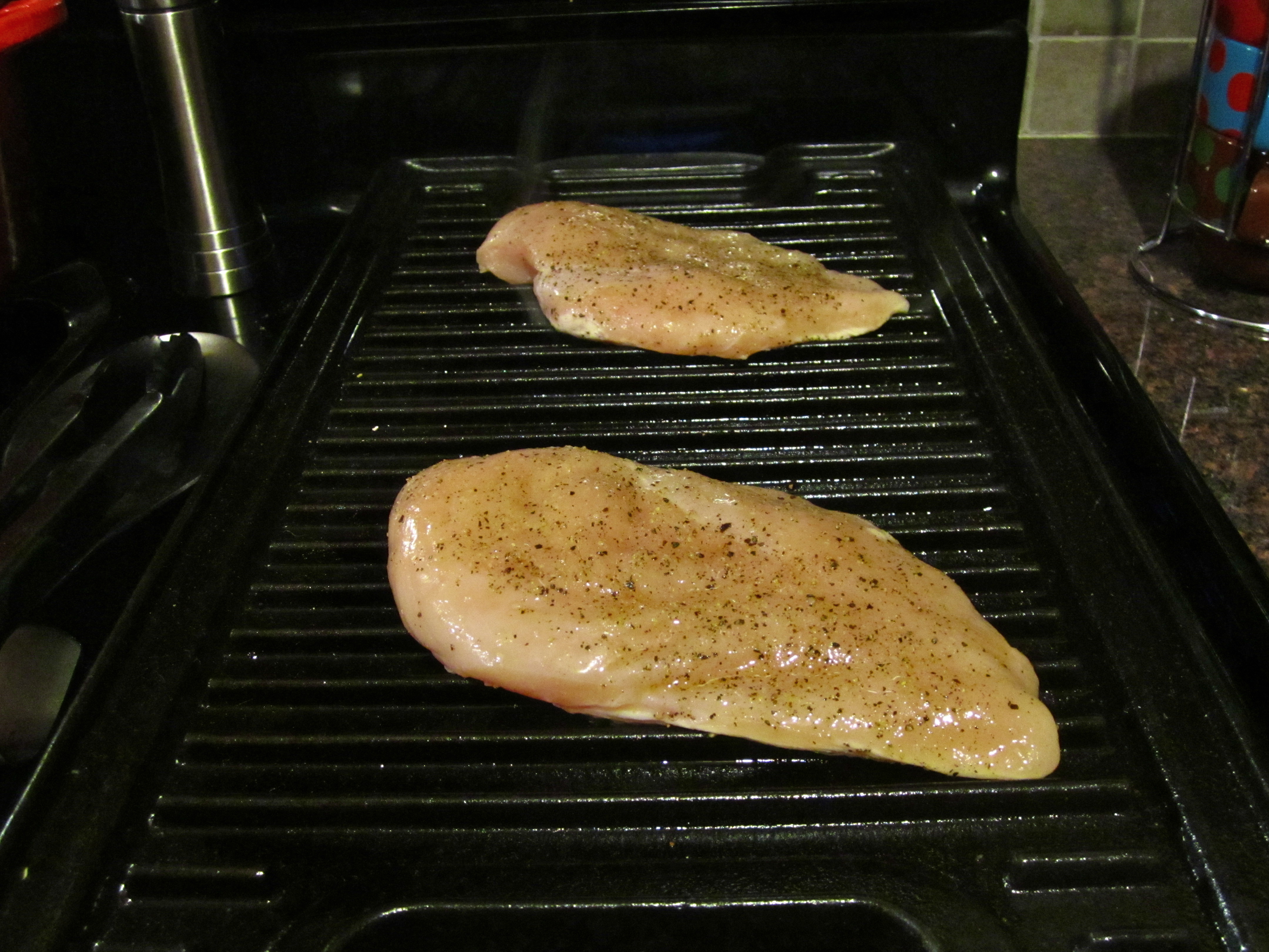 Heat an outdoor grill or indoor griddle over medium-high heat and brush with olive oil or Pam cooking spray. Season the chicken breast with the salt and pepper and brush with the olive oil.