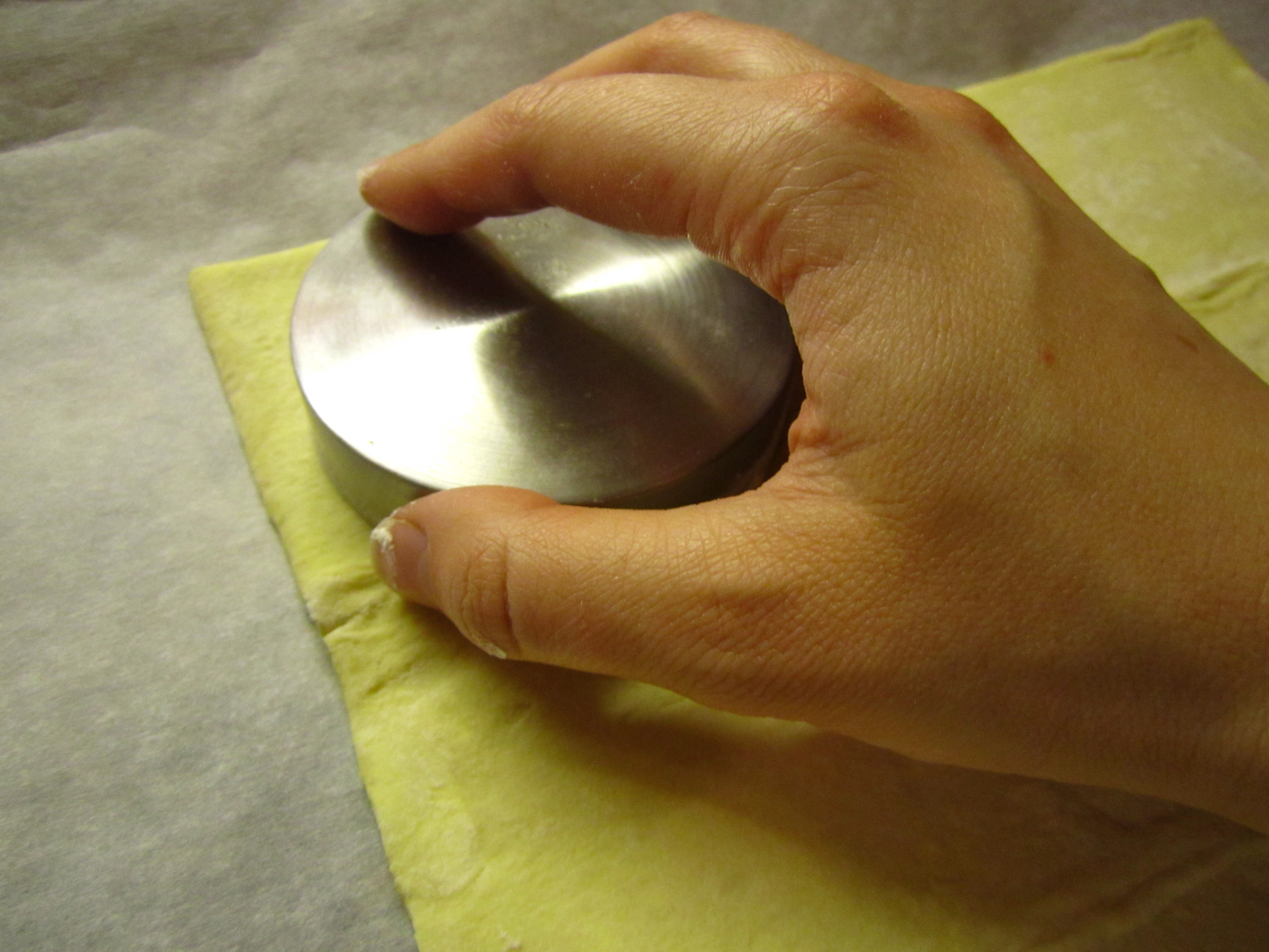 Place the puff pastry on a parchment-lined baking sheet. Using a cookie-cutter, cut five 3-inch circles into the pastry.