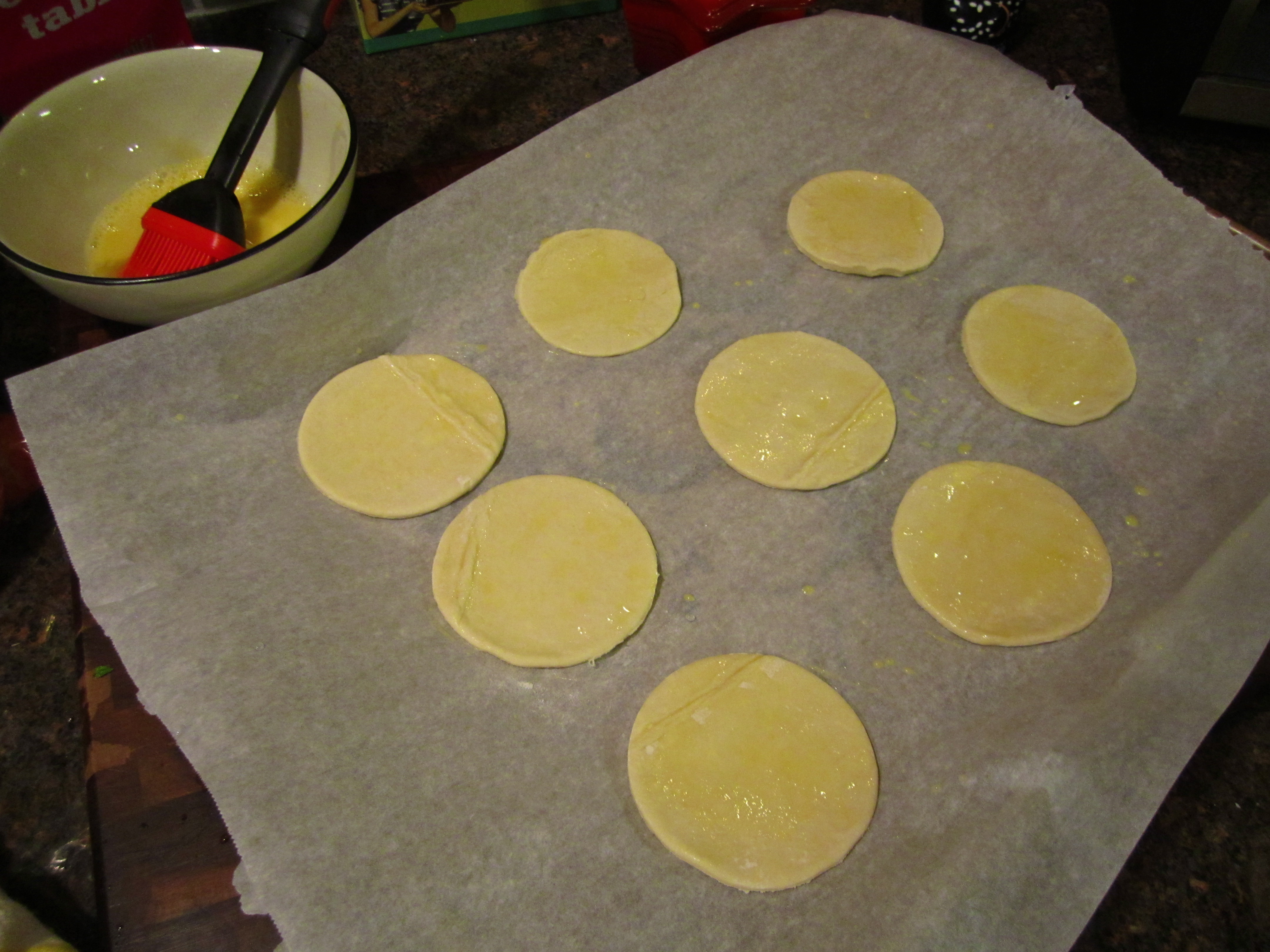 Discard the excess pastry and brush the tops of the circles with the egg wash.