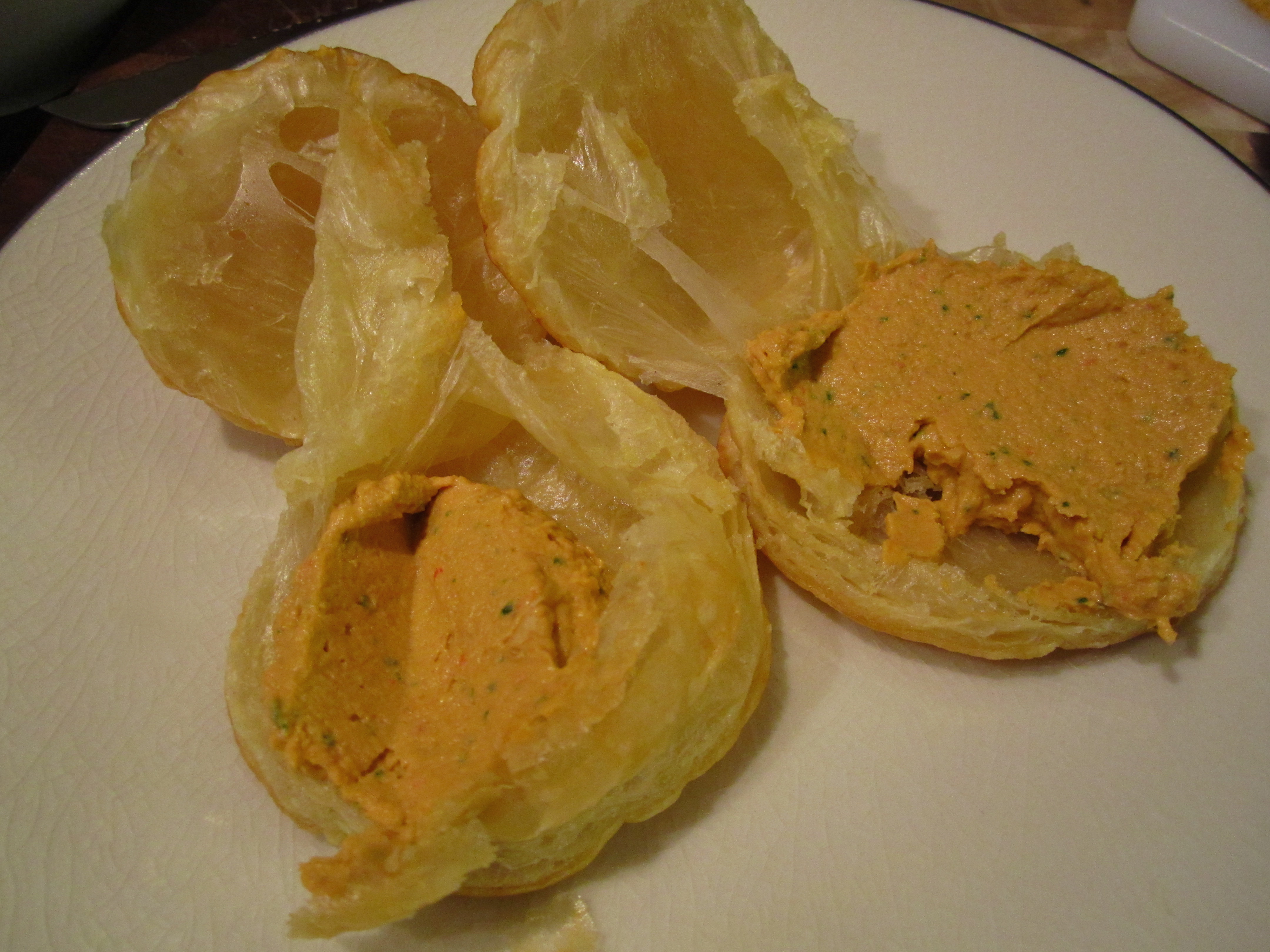 Bake until golden-brown and puffed. Remove from the oven and slice in half to make mini-sandwiches. Spread the hummus on the bottom of the puff pastry.