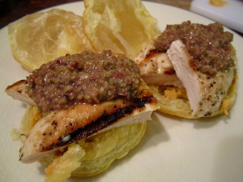 Top with the chicken then top with the olive tapenade.