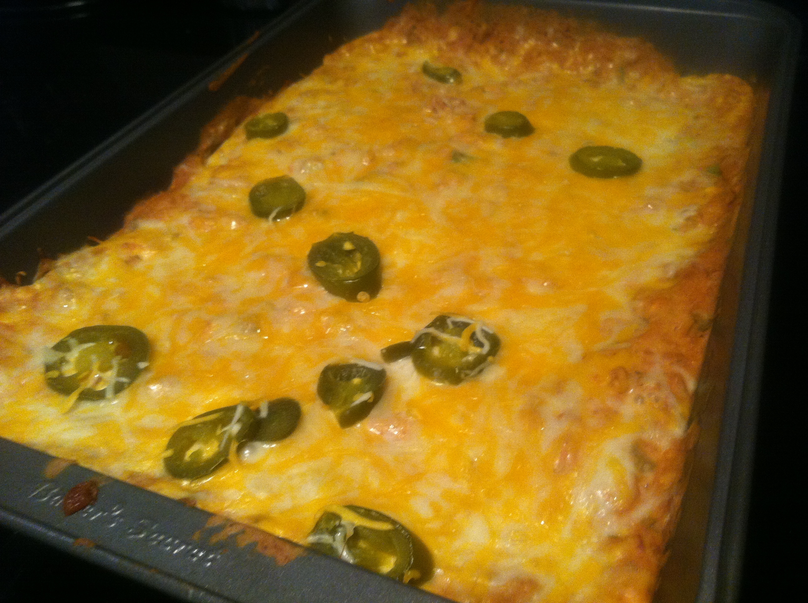 In a small casserole or square dish add the bean mixture. Top with the remaining cheese and a few jalapeño slices. Bake for 30 minutes until cheese is completely melted on top.