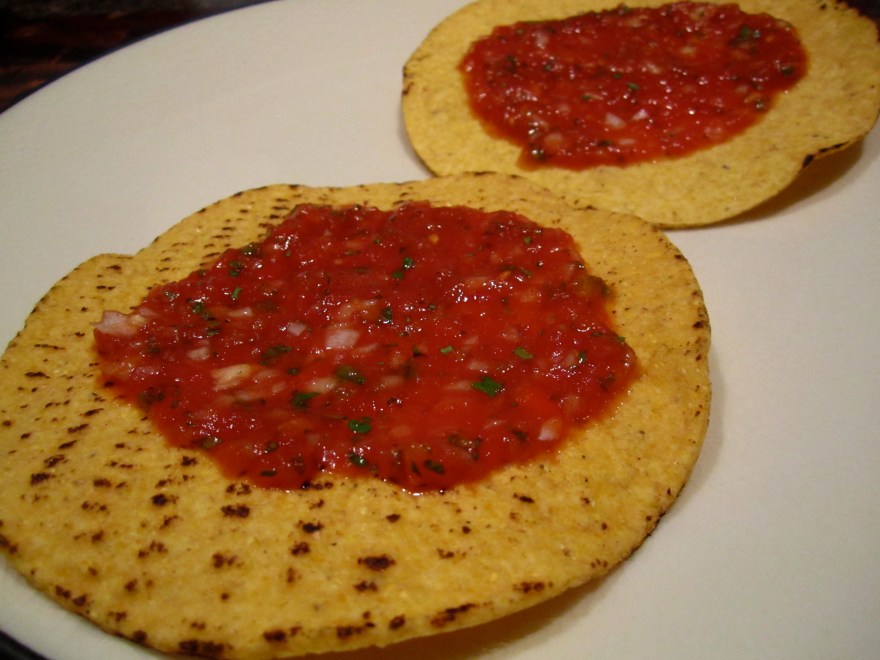 Start with the tostada shells and some of your favorite fresh salsa. For my salsa recipe click HERE. Smooth a tablespoon of fresh salsa onto the shells.