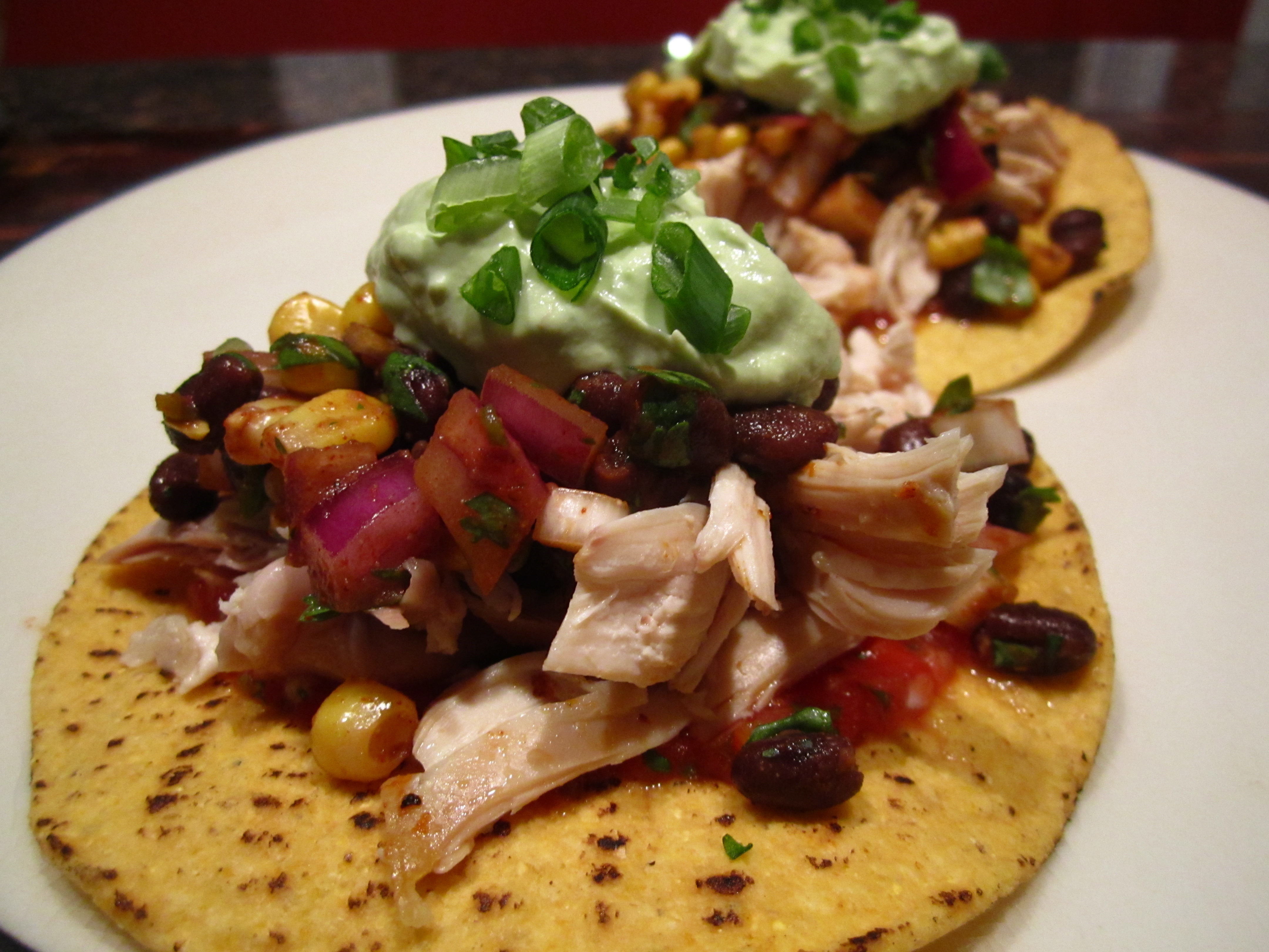 Top with the rotisserie chicken, a generous scoop of the black bean corn salsa, a dollop of the avocado cream, and sprinkle with the green onions.