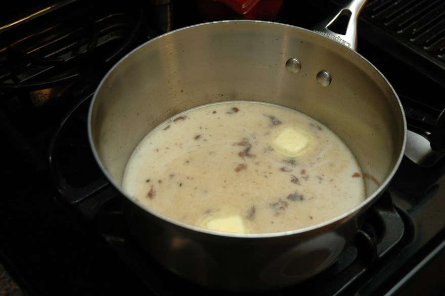 Add the chicken stock, milk, and butter to the pan and bring to a boil. Scrape up the brown bits from the bottom (flavor!!).