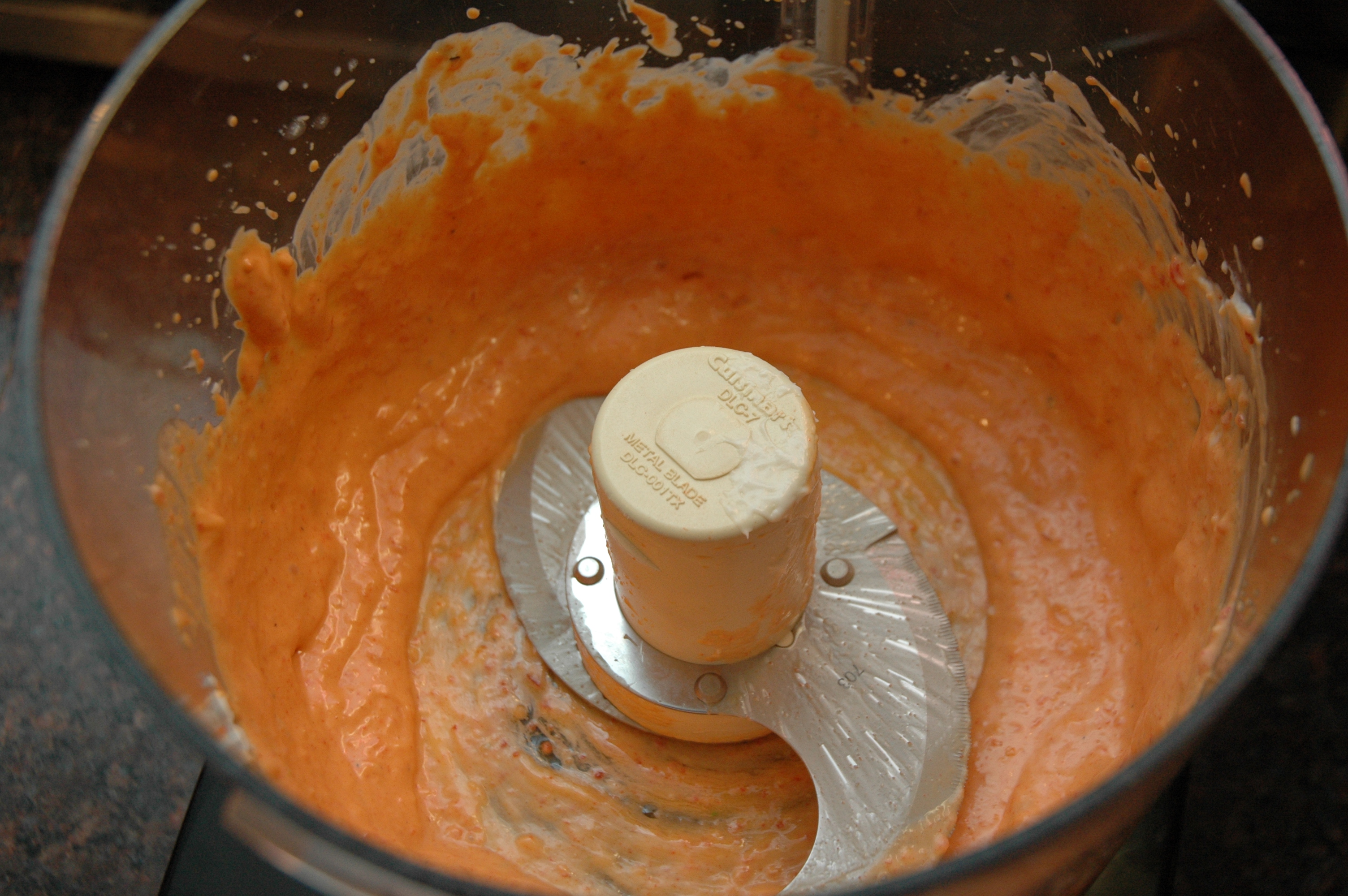 While the meat is cooking mix the next 5 ingredients, through the kosher salt, in a blender or food processor. Blend until smooth.