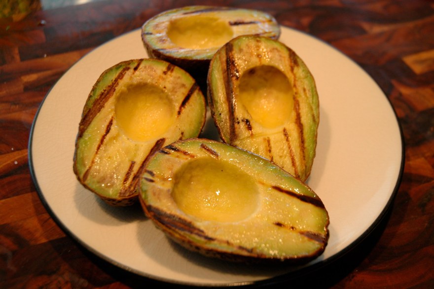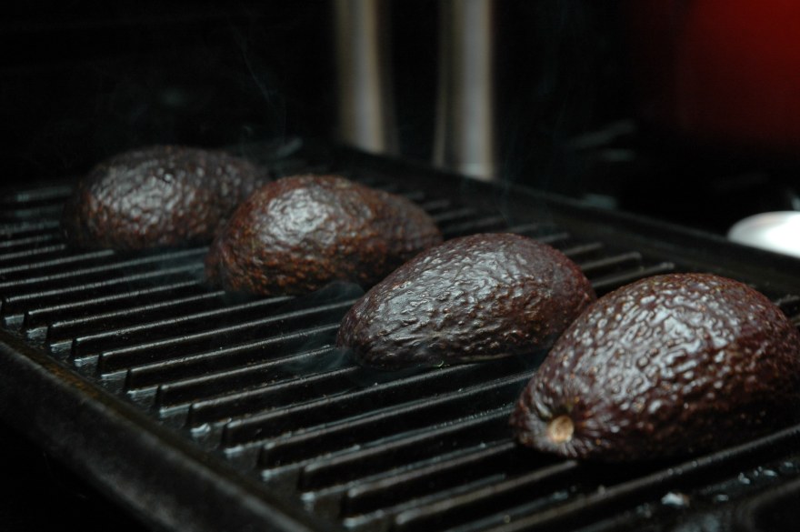 Place the avocado skin side down and grill until there are visible grill marks and the avocado is heated through.