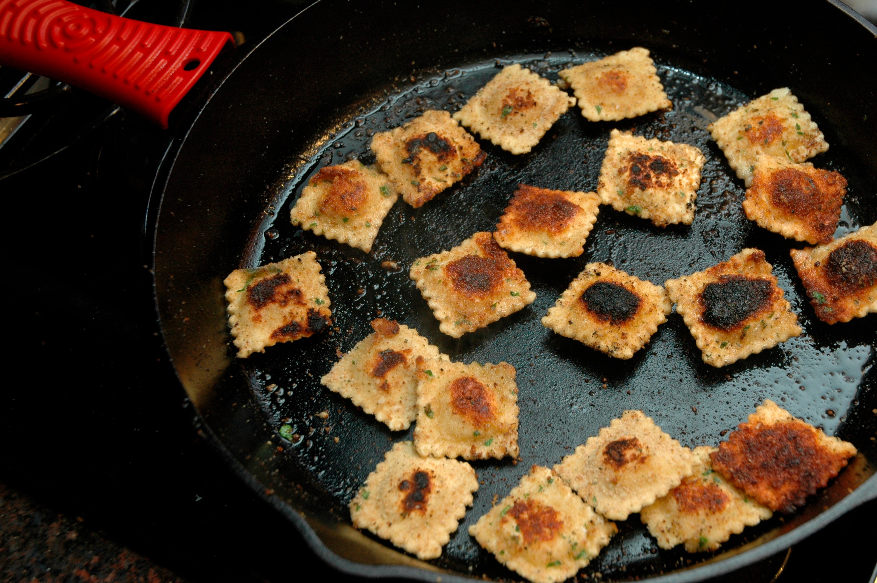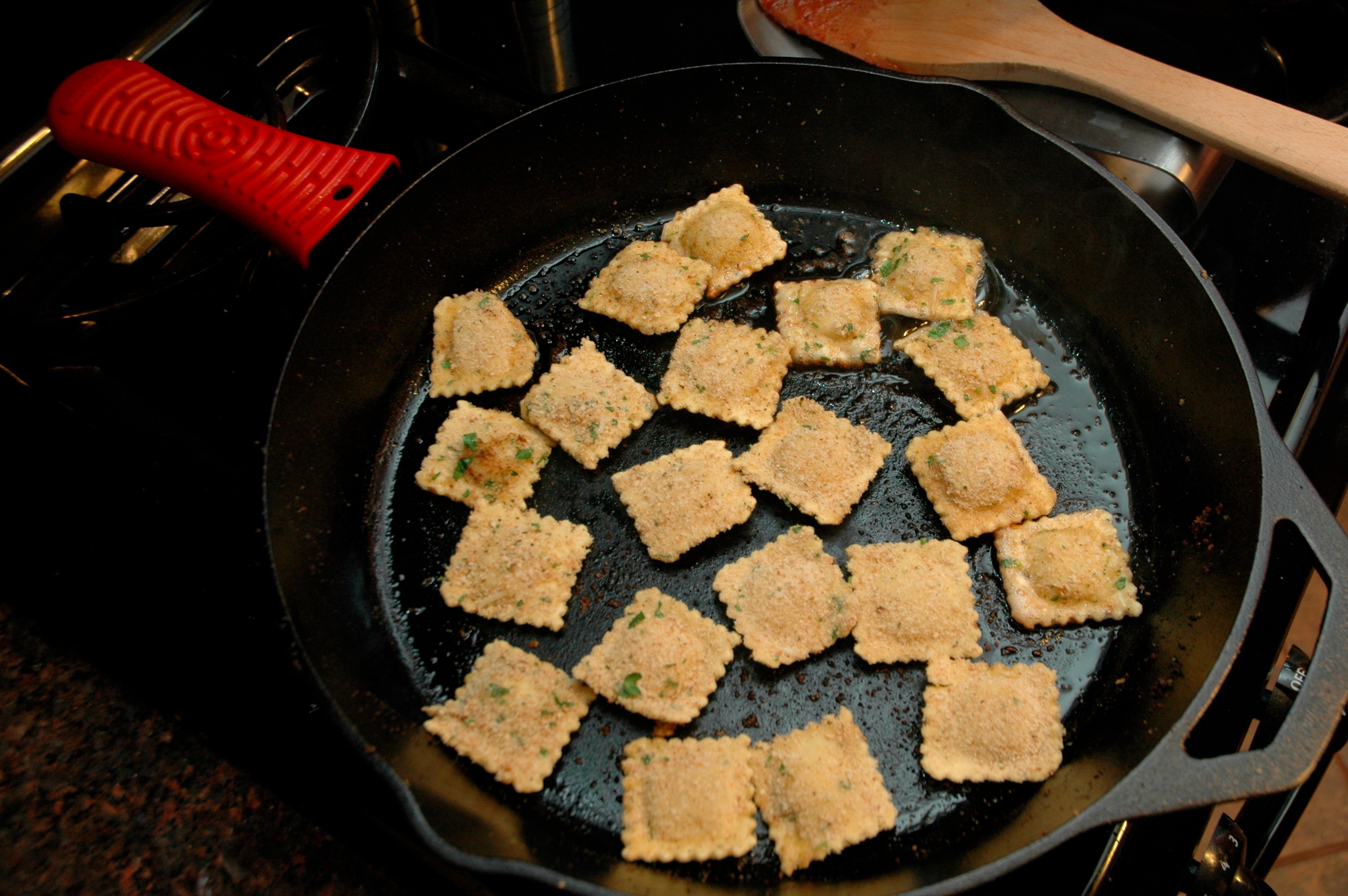 While the marinara simmers, In a large cast iron heat 1.5 tablespoons of canola oil over medium high heat. Working in batches, pan fry the ravioli until they are a deep golden color, around 3-4 minutes on each side.