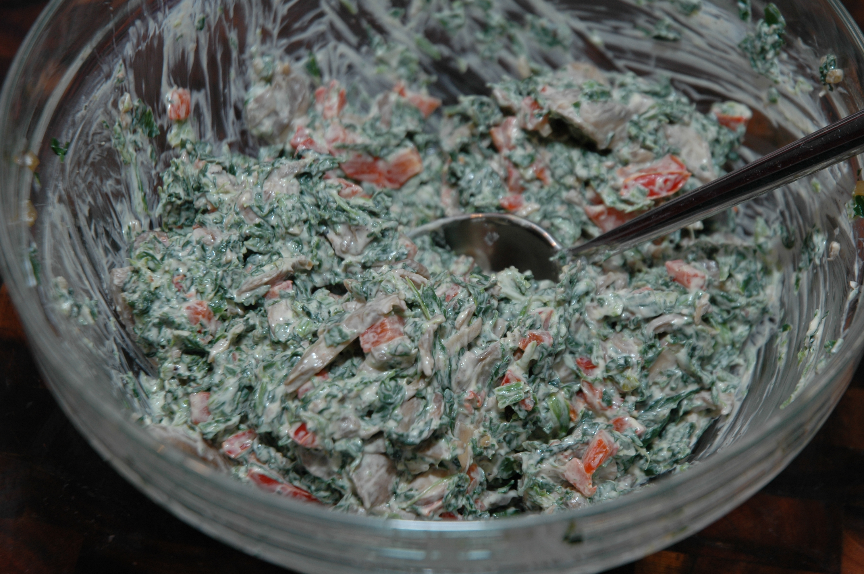 In a large bowl mix in the cream cheese and sour cream into the spinach mixture until well combined.
