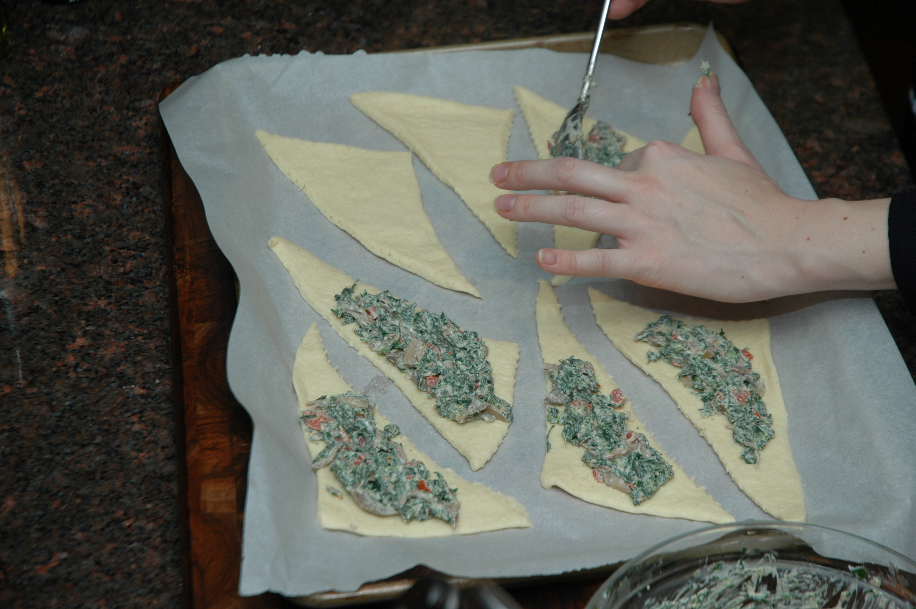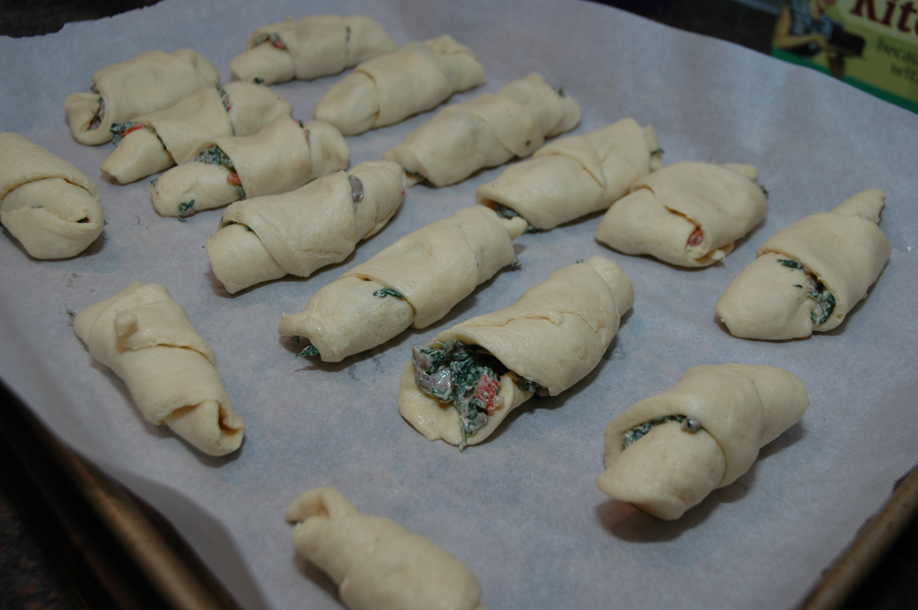 Spread the mixture evenly on the crescent roll leaving a slight border. Roll up starting from the flat end.