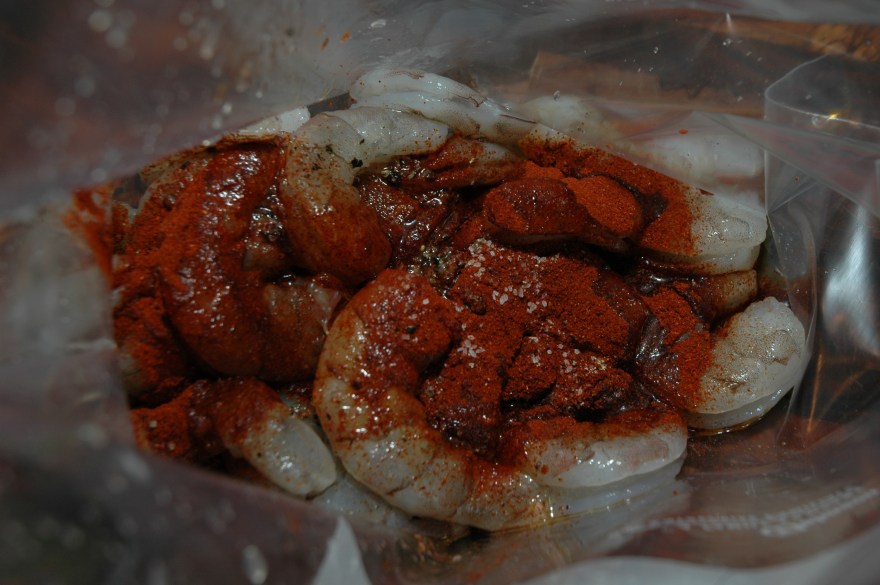 For the shrimp, combine the first 6 ingredients, through the black pepper, in a large bag and marinade for 15-20 minutes.