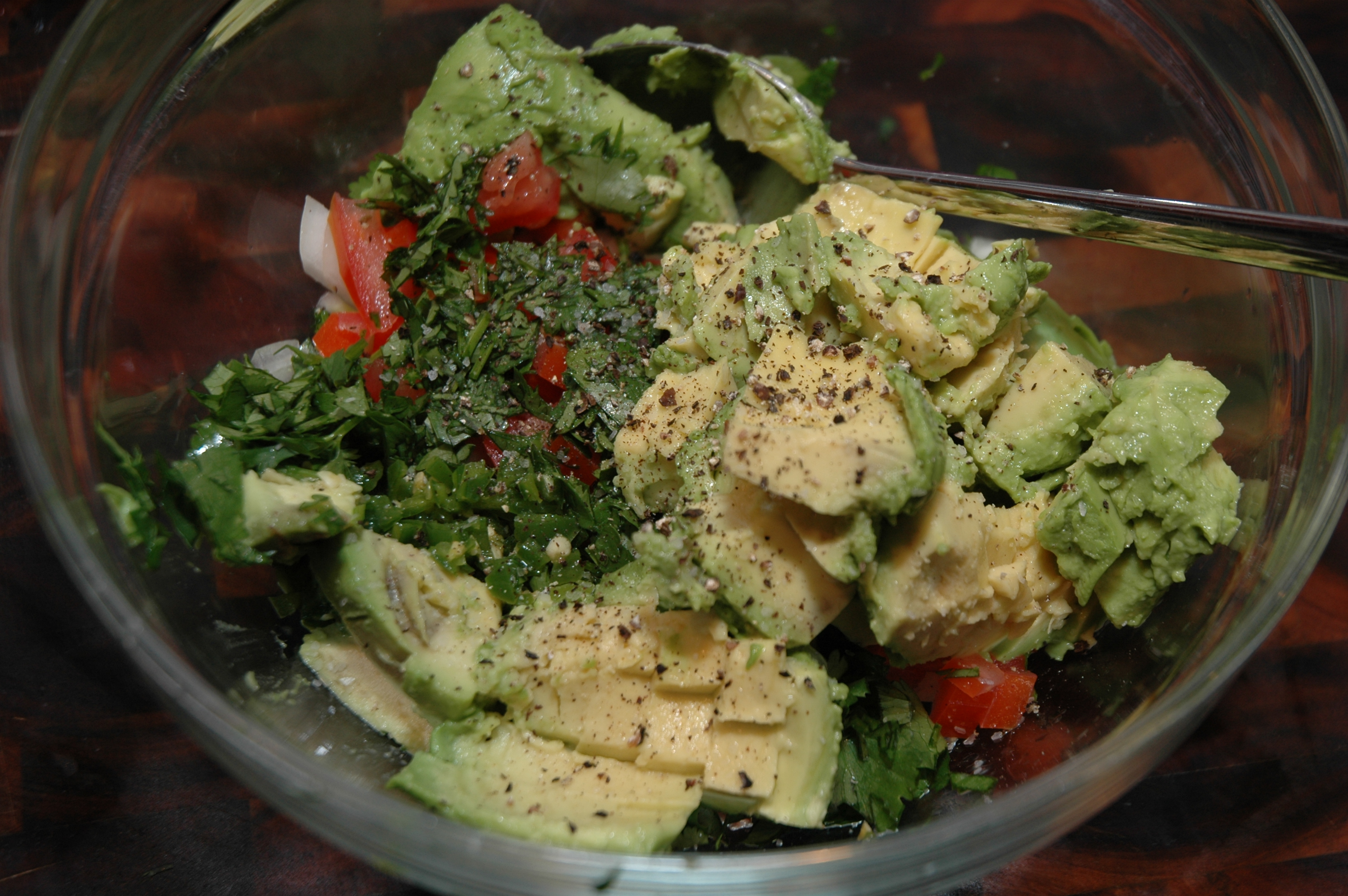 While the shrimp is marinating make the salsa by combing the avocado and next 5 ingredients, through the cilantro, in a large bowl. Set aside.