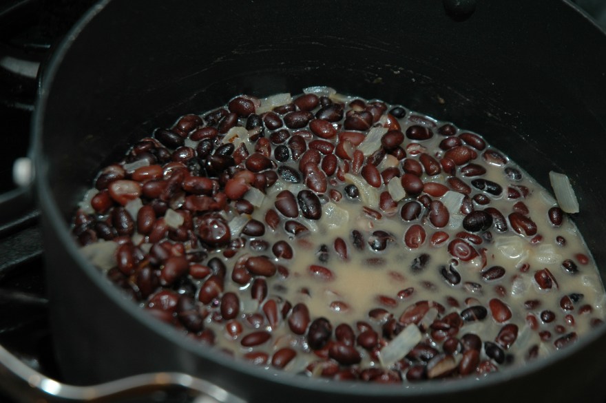 While the shrimp is grilling heat the remaining olive oil in a medium sauce pan and saute the remaining onions until translucent. Add the beans and chicken broth, reduce for about 10 minutes.