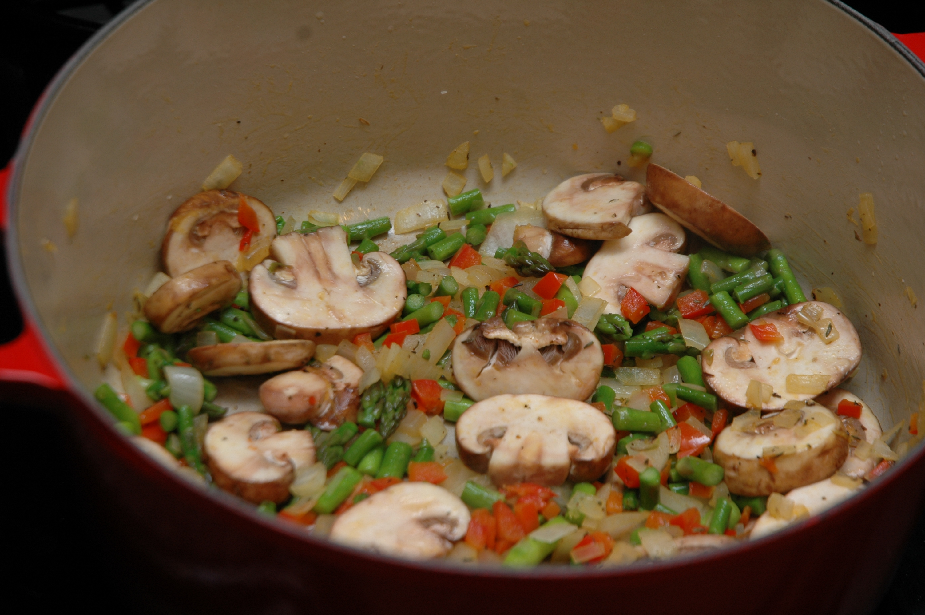 Add the asparagus and saute for 2-3 minutes, add the mushrooms. Saute until the mushrooms are soft and the liquid is evaporated.