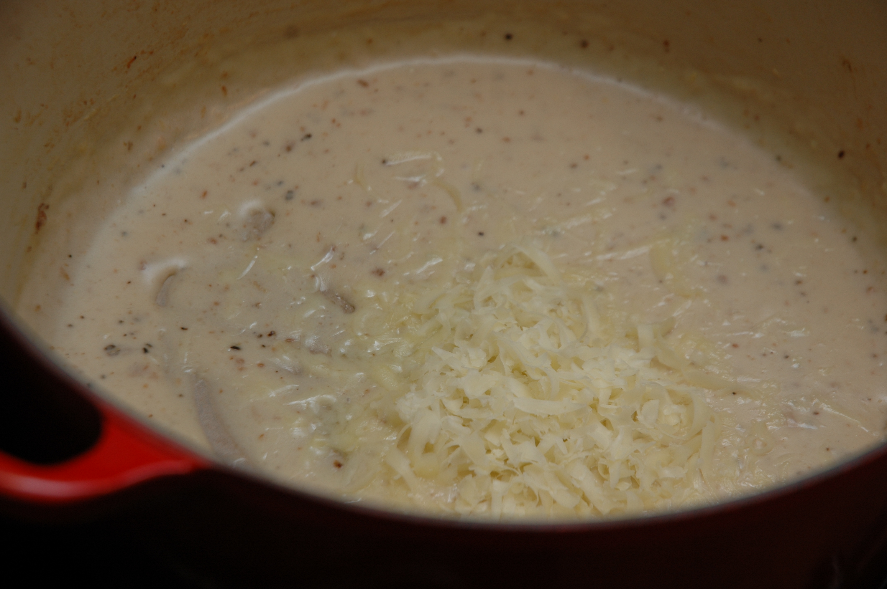 Reduce the heat to medium low and season with the salt and pepper. Remove from the heat and add the cheese.