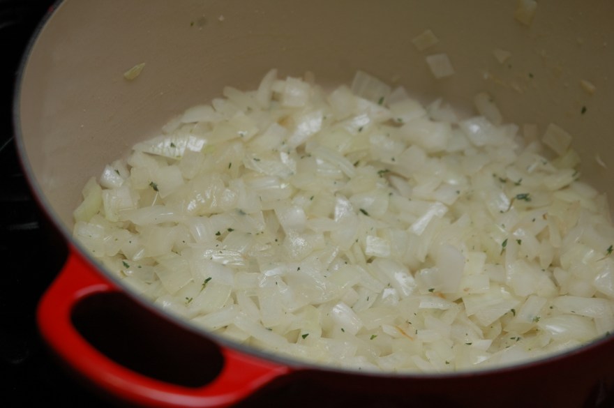 Heat the olive oil in a large dutch oven over medium heat. Add the onions and next 4 ingredients, through the thyme.