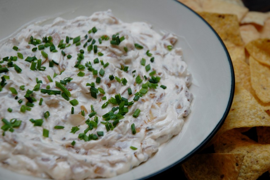 I was in a French onion dip type of mood tonight so I thought I would crank it up a notch by caramelizing the onions until nice and sweet. Caramelizing is a labor of love but so worth it. The onions turn into these little pieces of scrumptious candy…I could just eat it with a spoon (sorry honey).