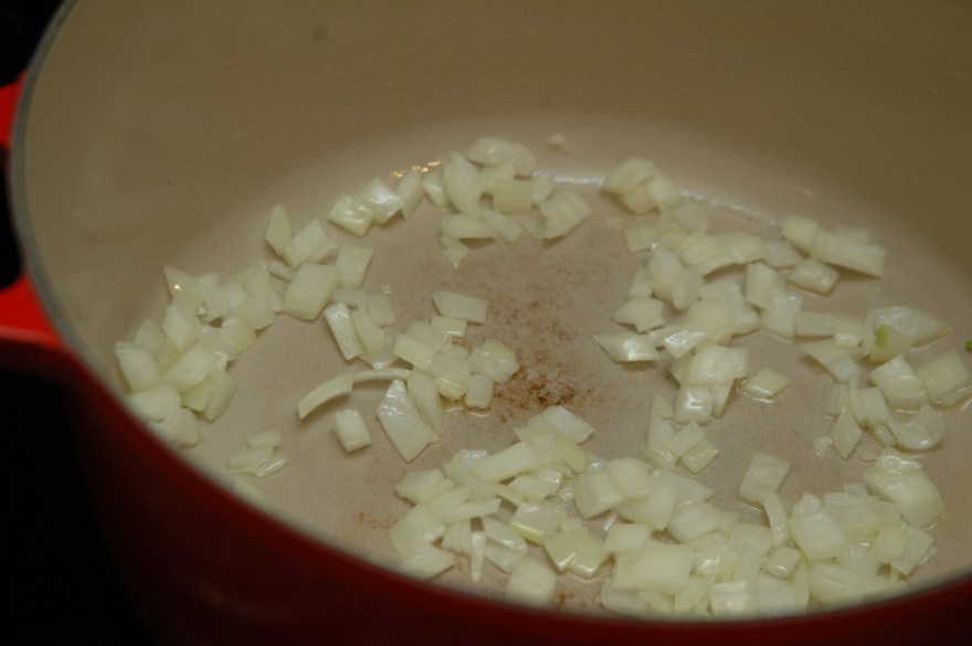 Heat the olive oil in a large skillet over medium high heat. Saute the onions until soft then add the garlic. Saute for 30 seconds until fragrant.