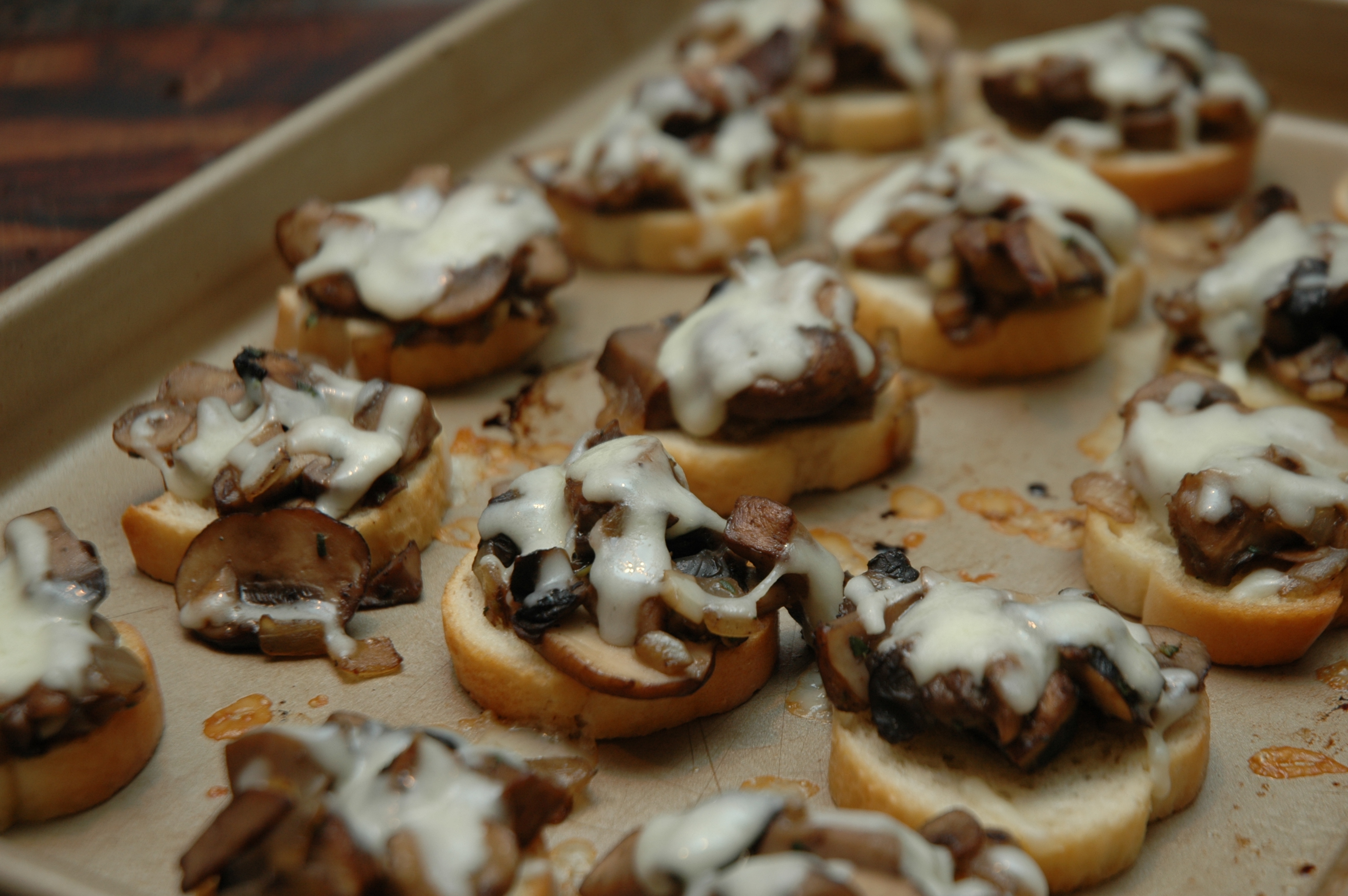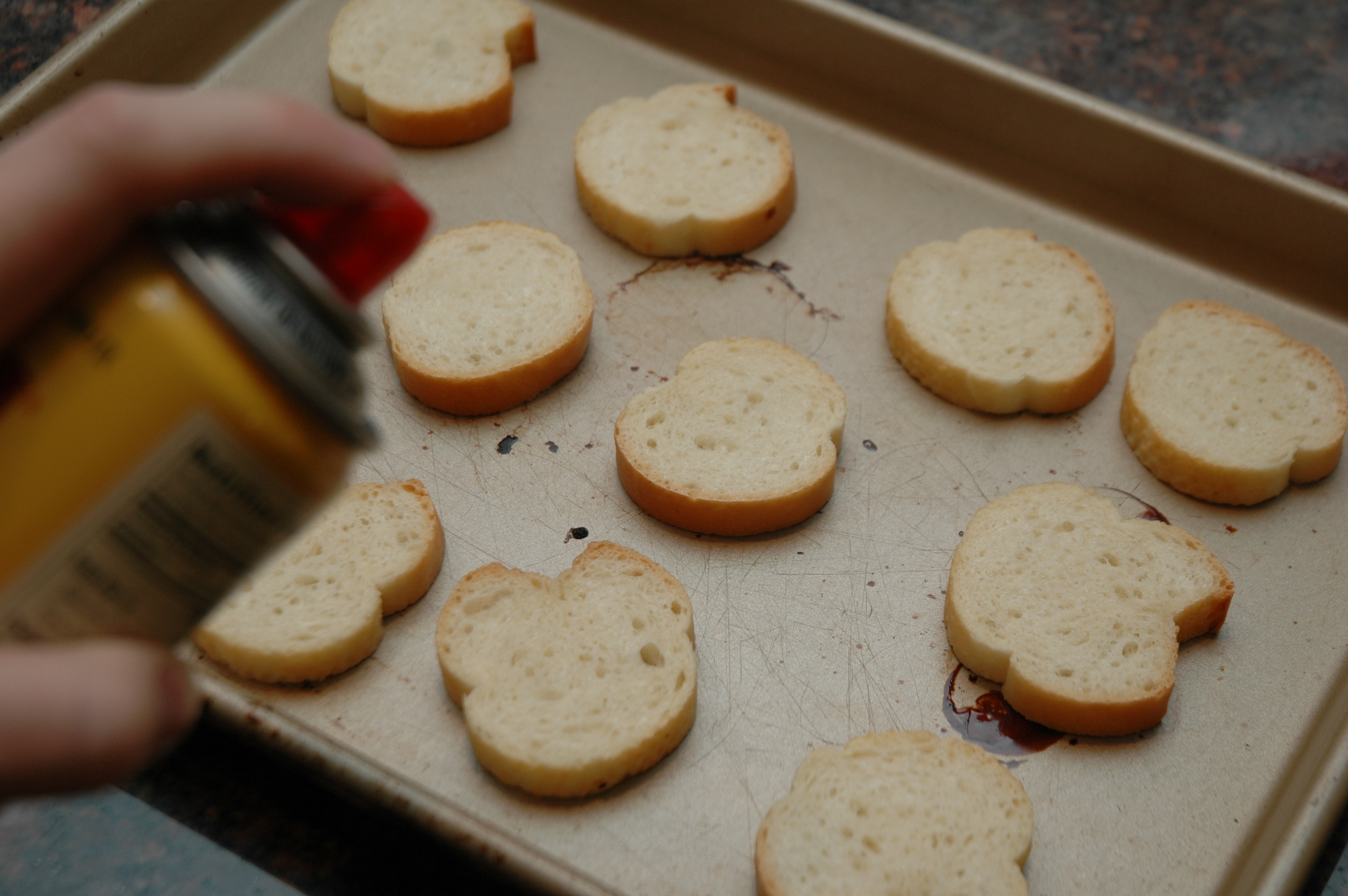 While the mushrooms are sautéing place the baguette slices on a large cooking sheet and spray with the cooking spray.