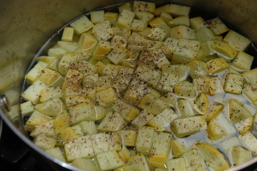 Boil a large pot of water over high heat and add the squash. Season with salt and pepper and cook until tender.