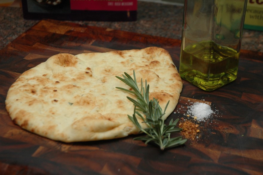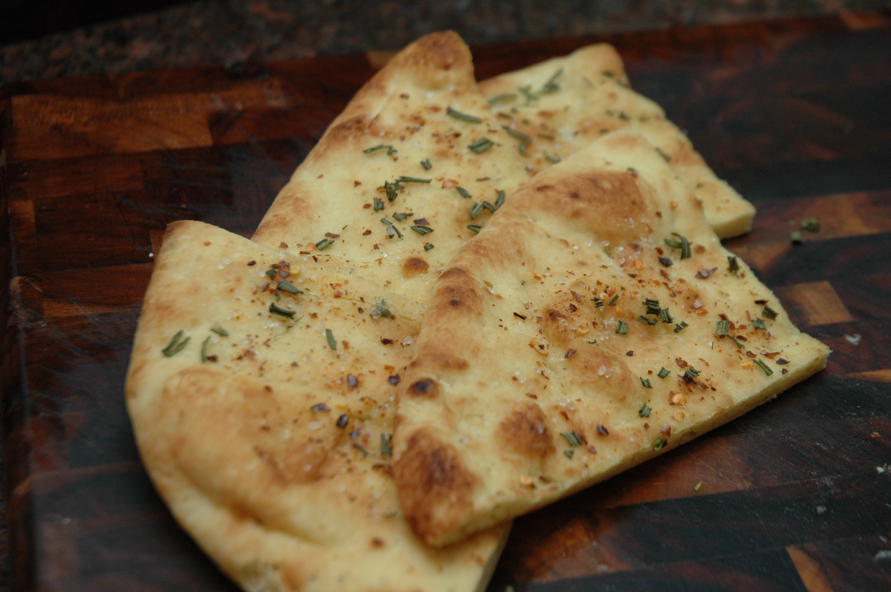 To prepare the bread brush the Naan with the olive oil and sprinkle with the salt and pepper. Using kitchen shears cut the rosemary evenly on top. Bake until lightly browned. Use the bread to sop up any extra sauce!