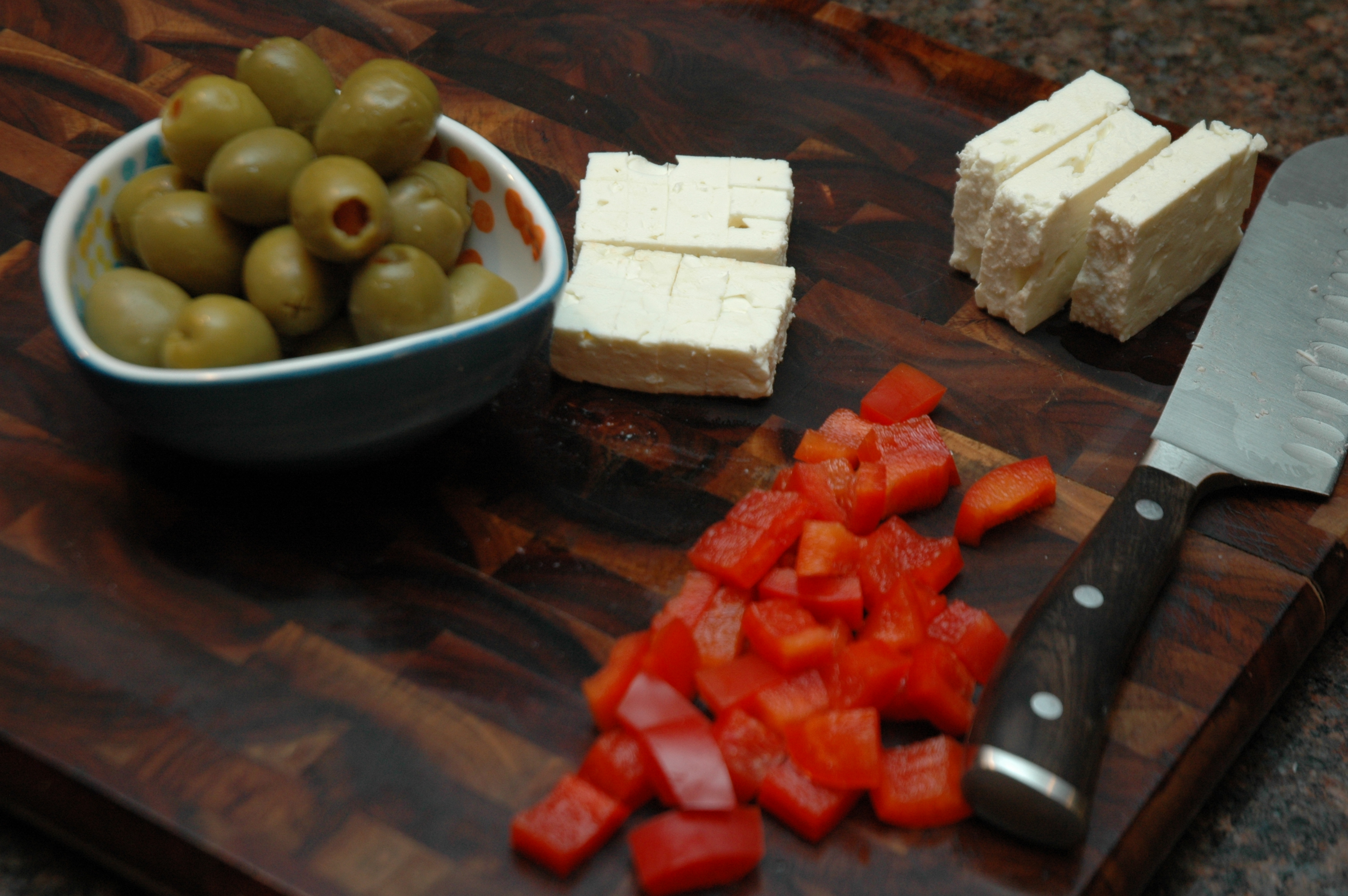 Using a small skewer or toothpicks layer with an olive first, followed by the bell pepper, cheese, and another olive.