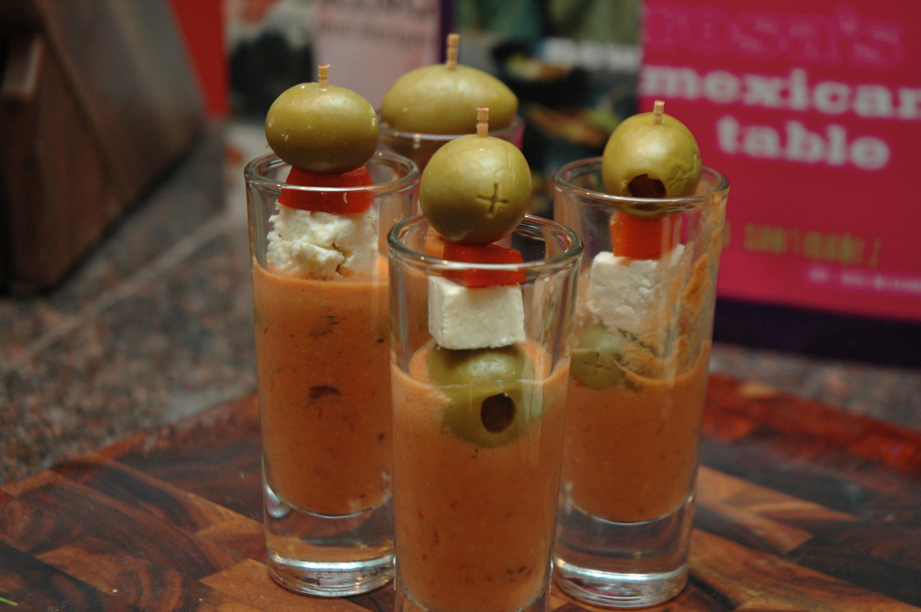Pour the sauce into tall shot glasses halfway through, and finish off with the mini olive skewers.