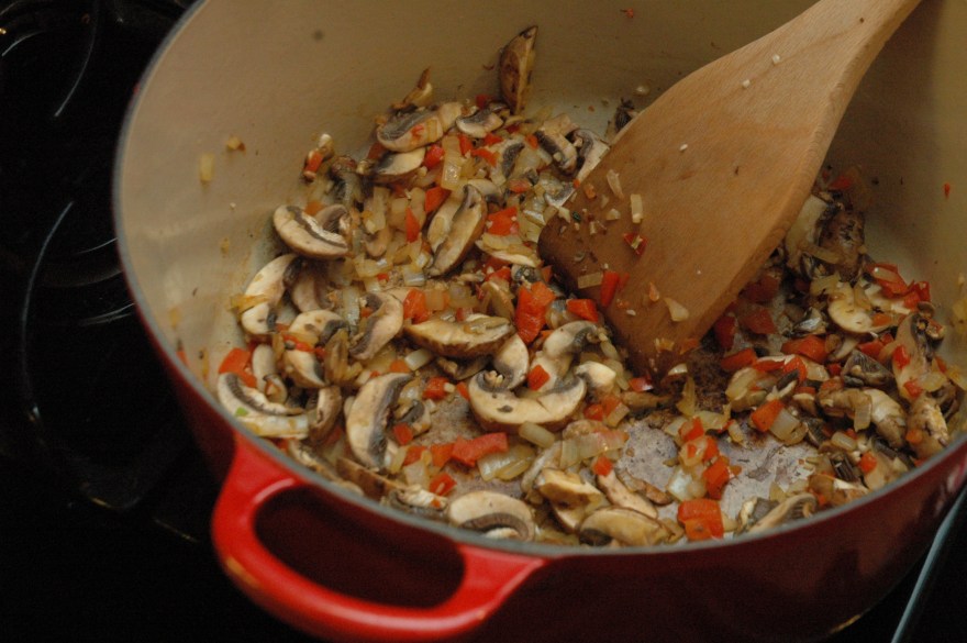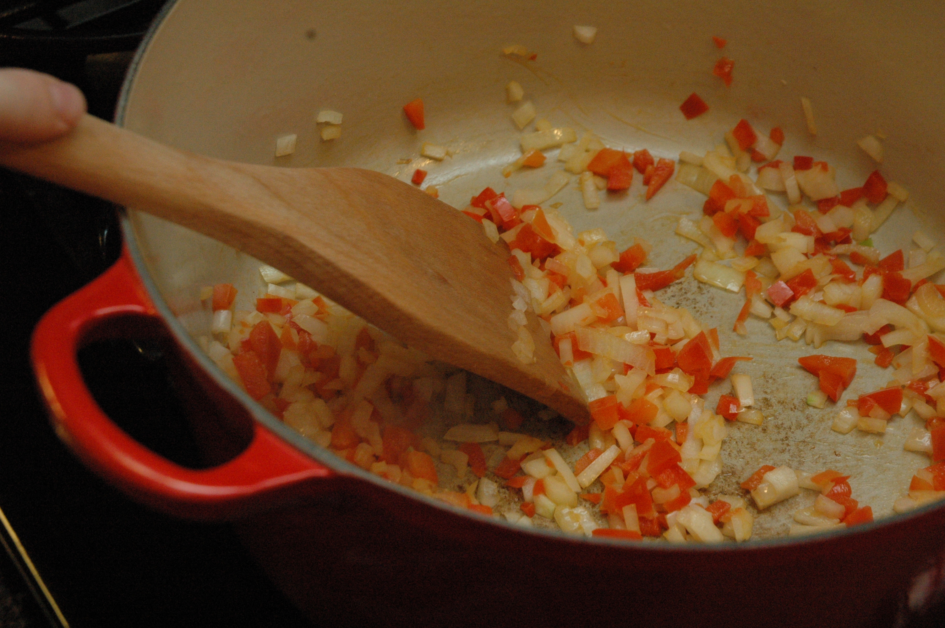 In a large dutch oven preheat the oil over medium high heat. Saute the onion and bell pepper until softened.