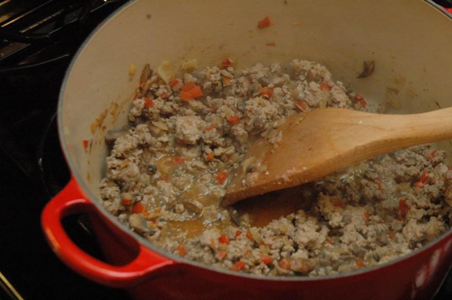 Crumbling with a wooden spoon add the turkey and cook until no longer pink.