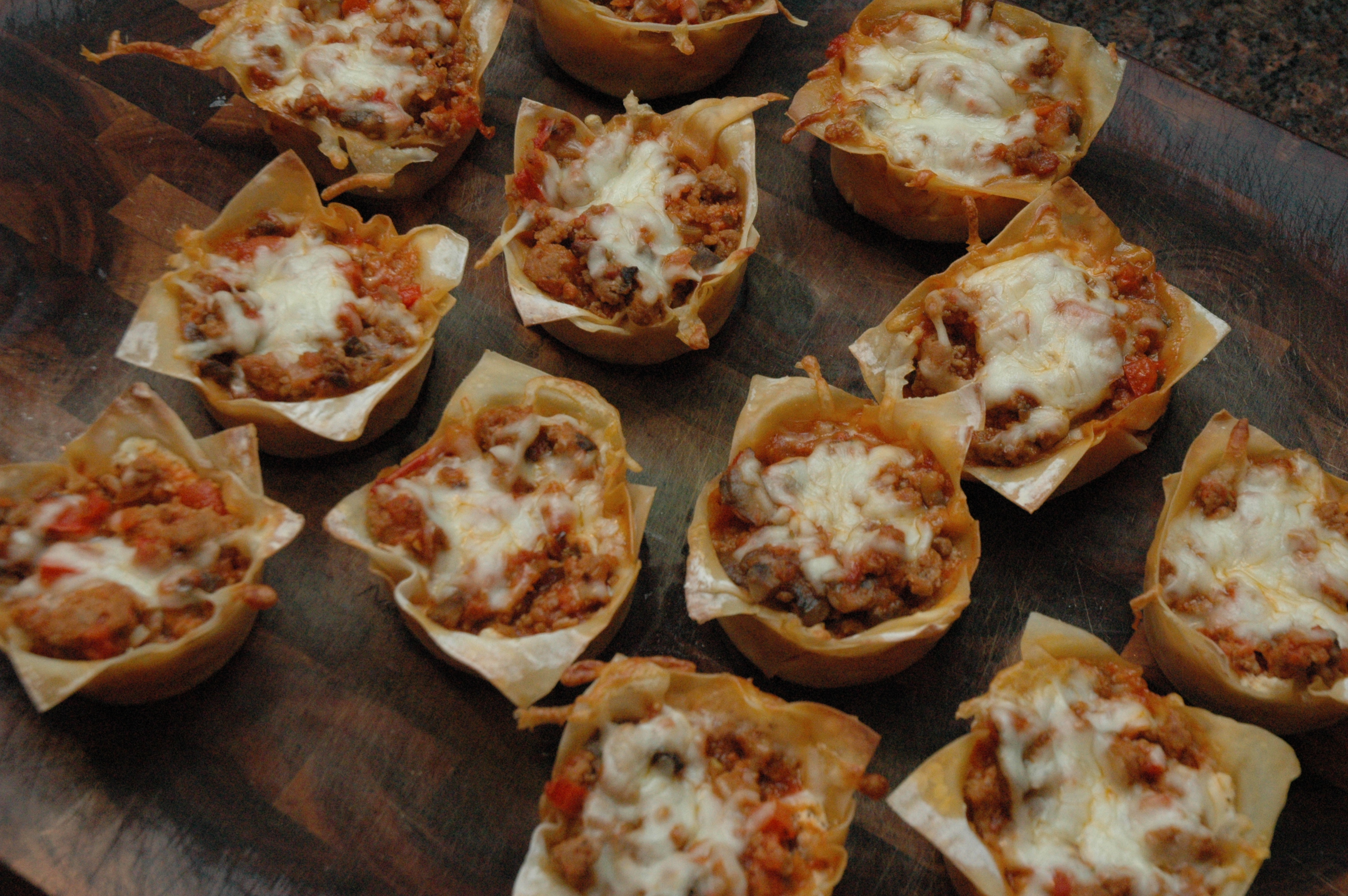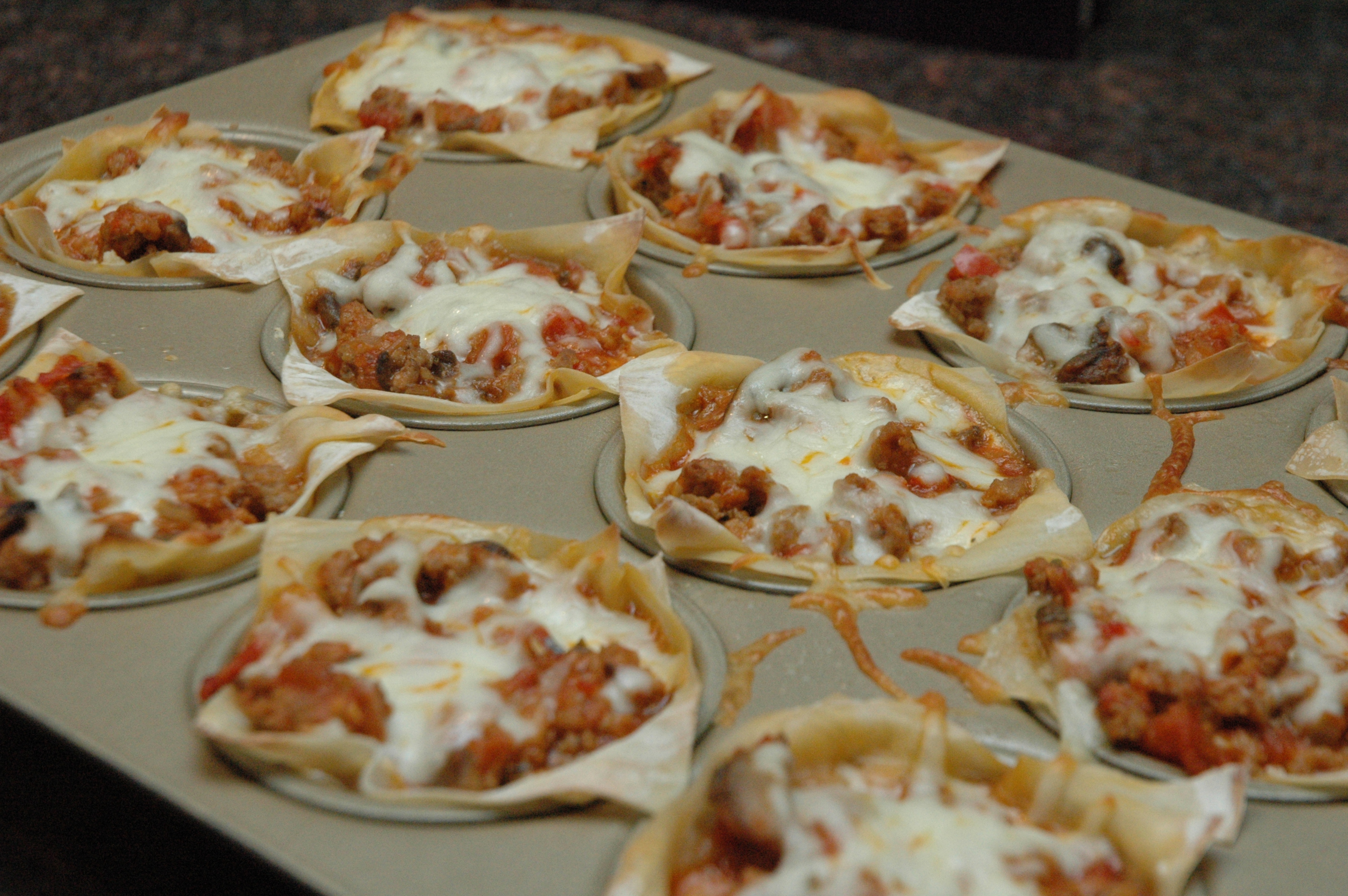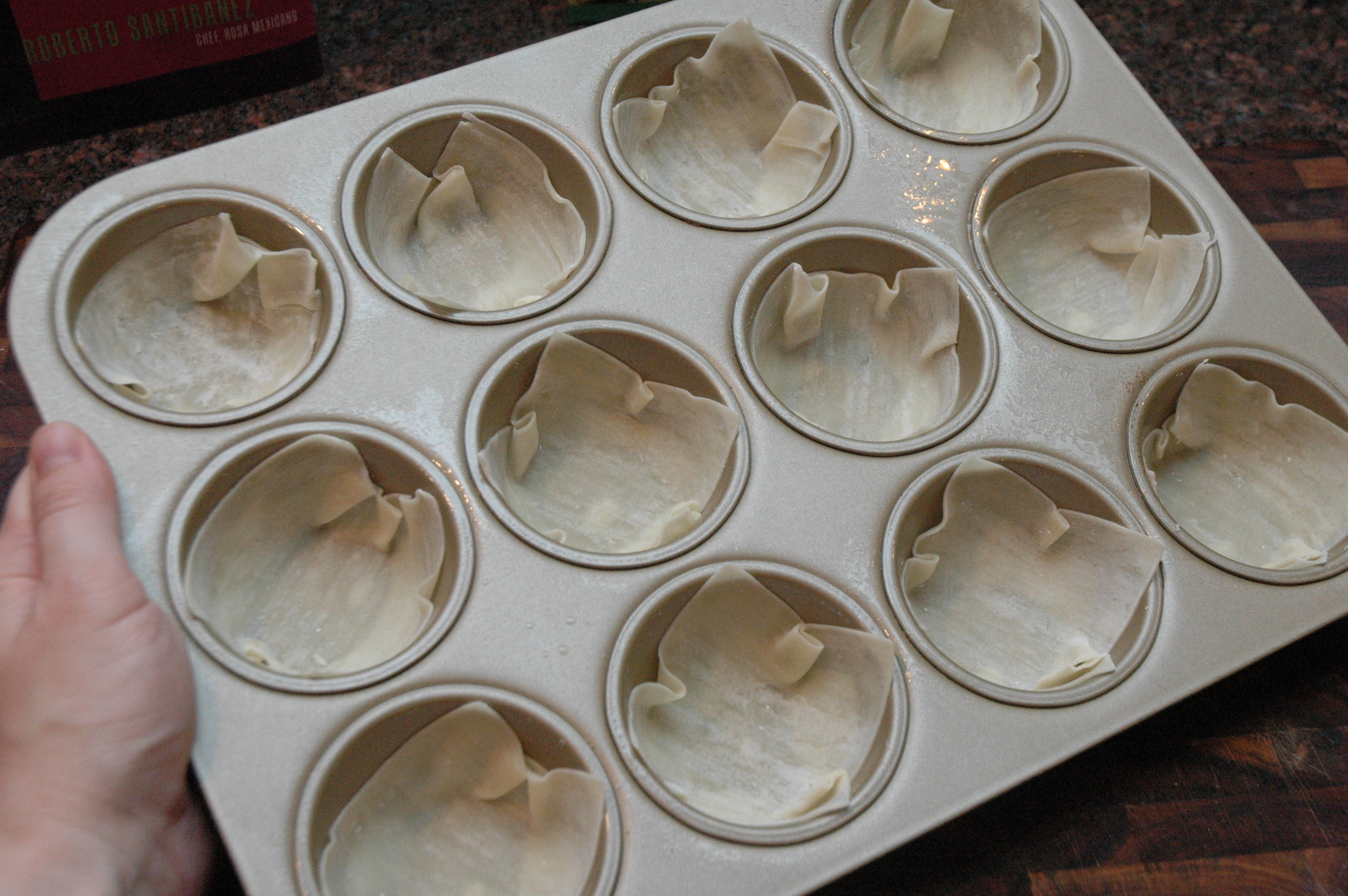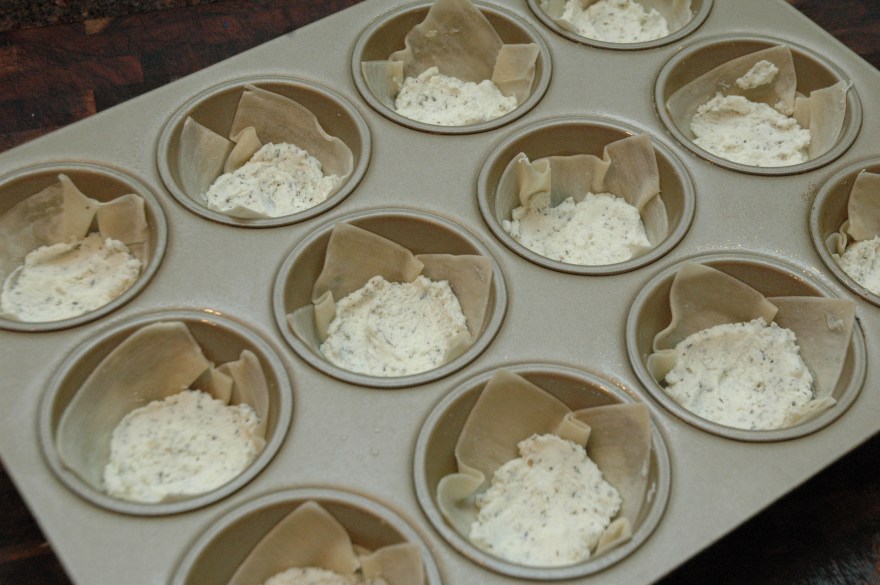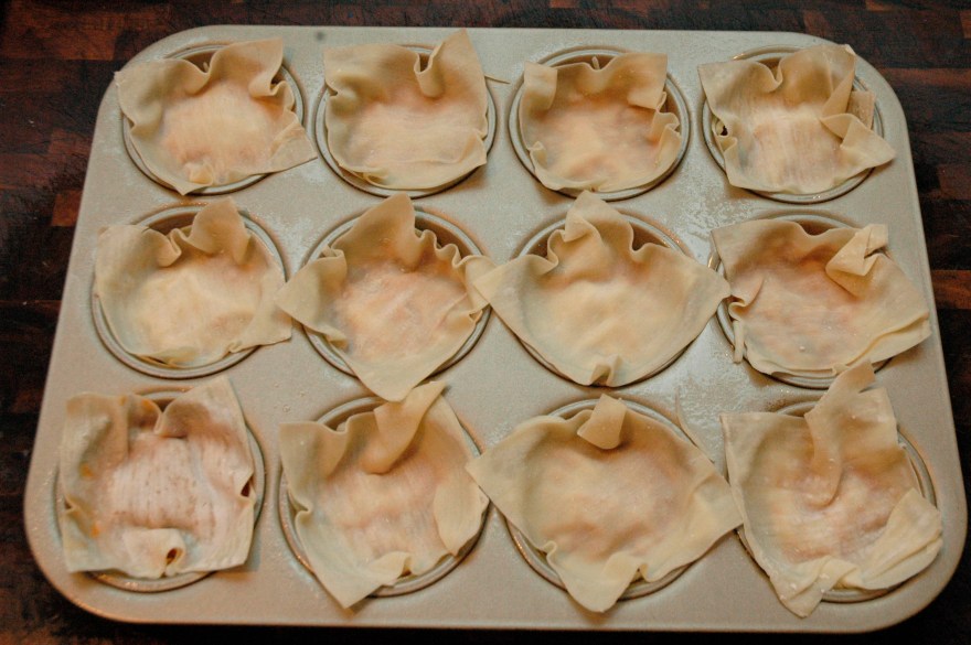 Spray a 12 cup muffin tin with cooking spray and press a wonton wrap into the bottom of the tin, covering the bottom and the sides.