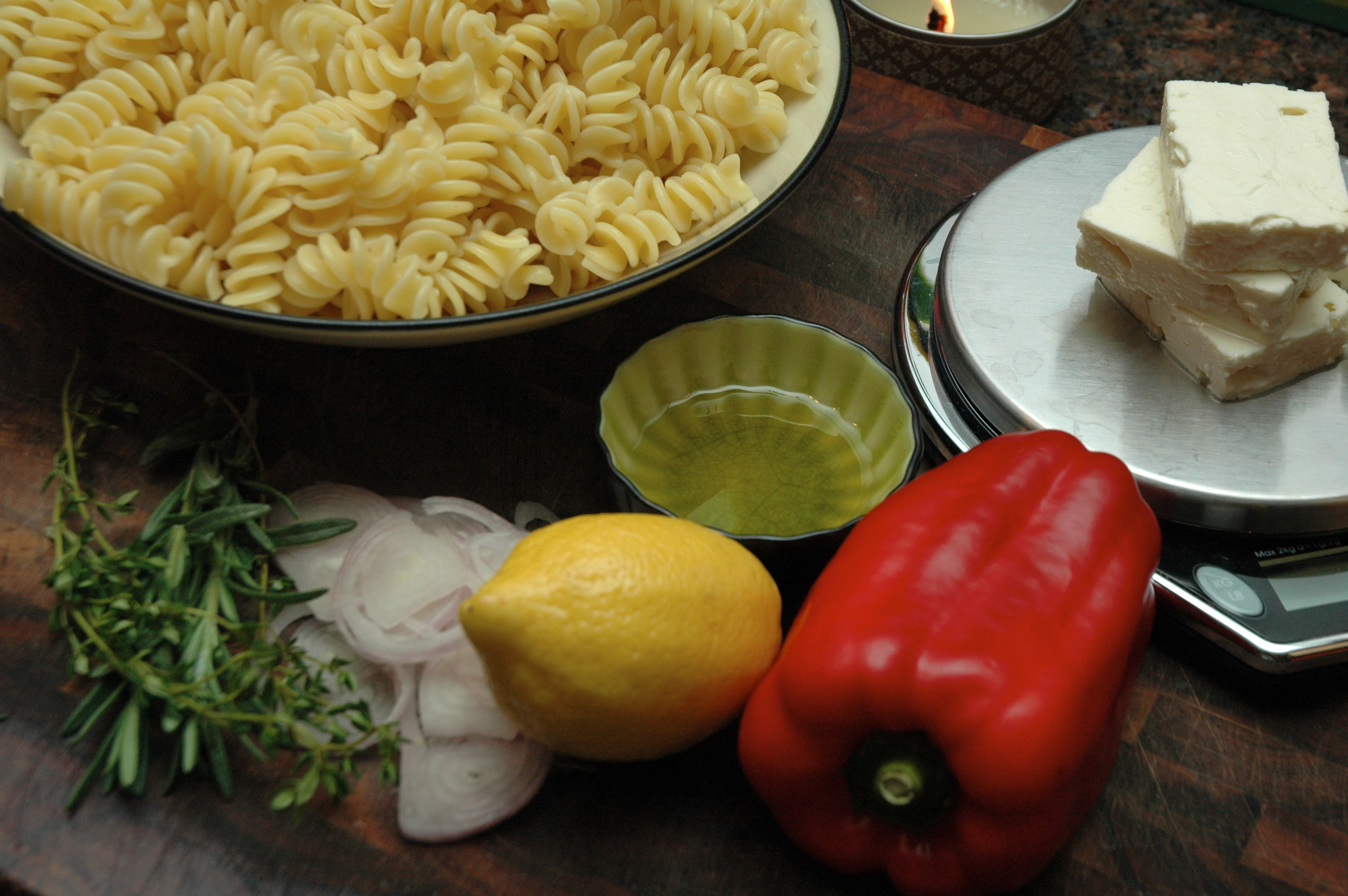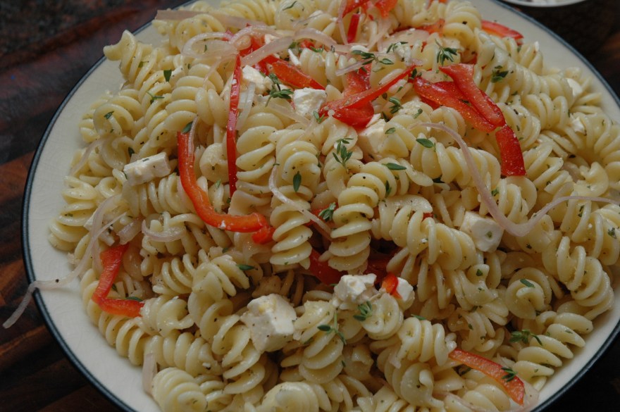 Hair metal, parachute pants…..and pasta salad? Yes pasta salad was huge in the 80’s. That fun colorful fusilli wrapped in herbs and whatever else mom had on hand that day. So for tonight’s Top 8 result’s show on American Idol I’m whipping up (literally) the quickest recipe I’ve done to date. And I get an excuse to use up some extra veggies sitting in the fridge.