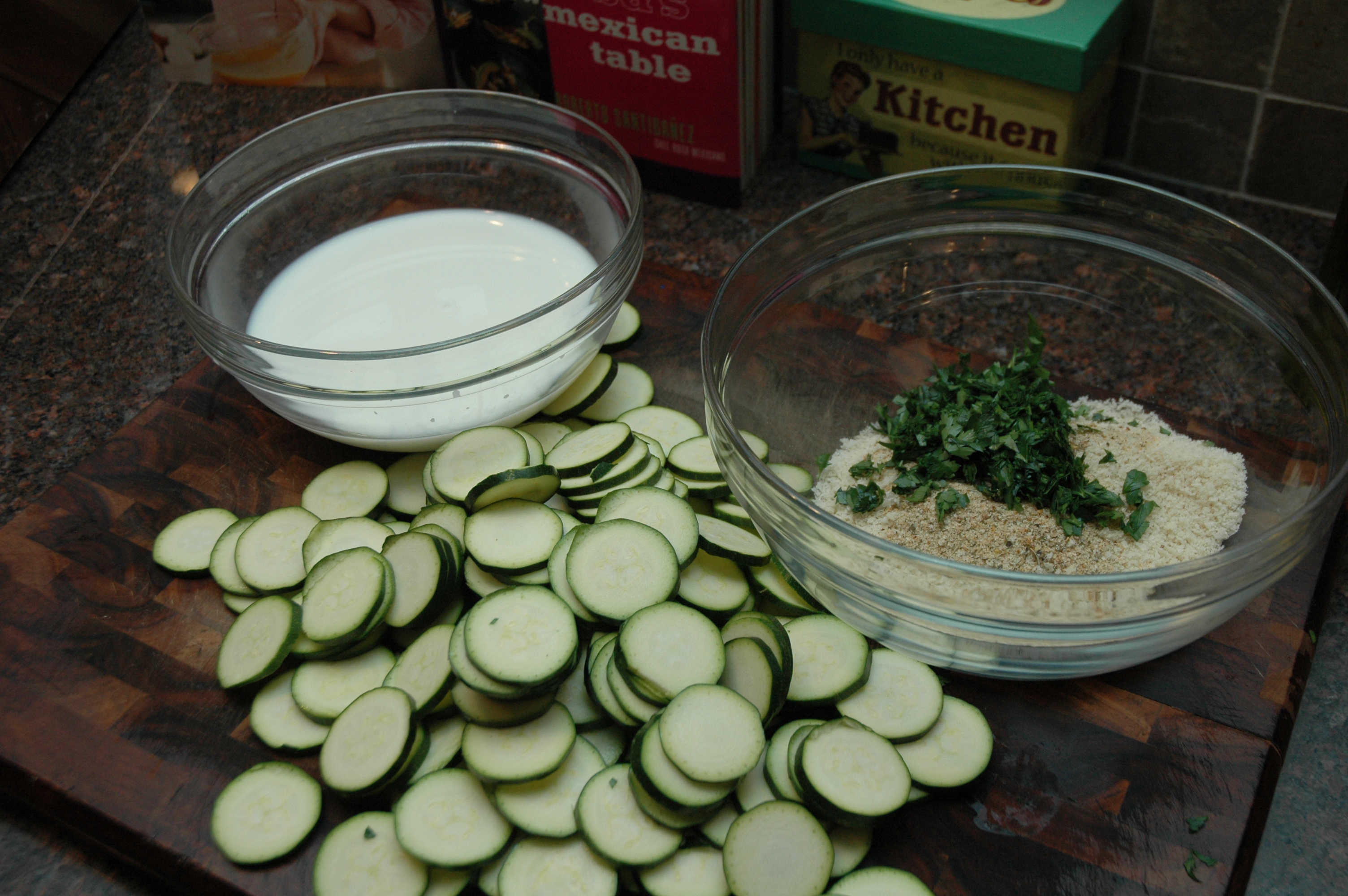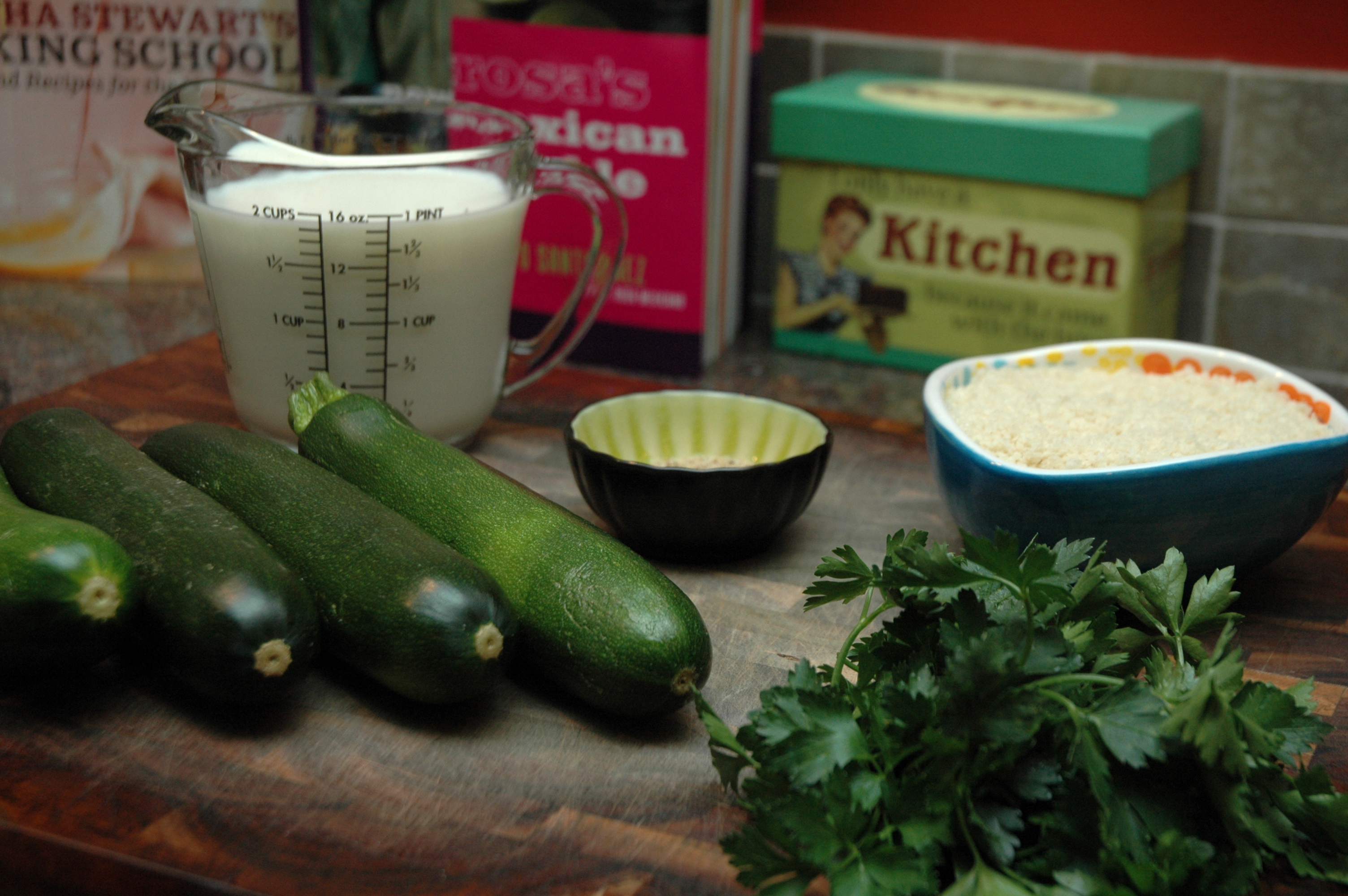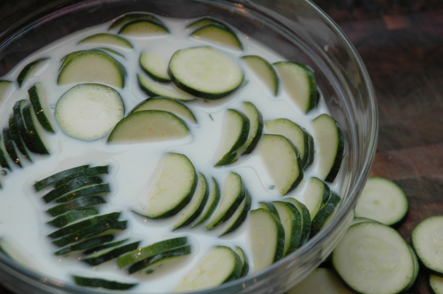 Dip the zucchini in the milk, shaking off any access liquid.
