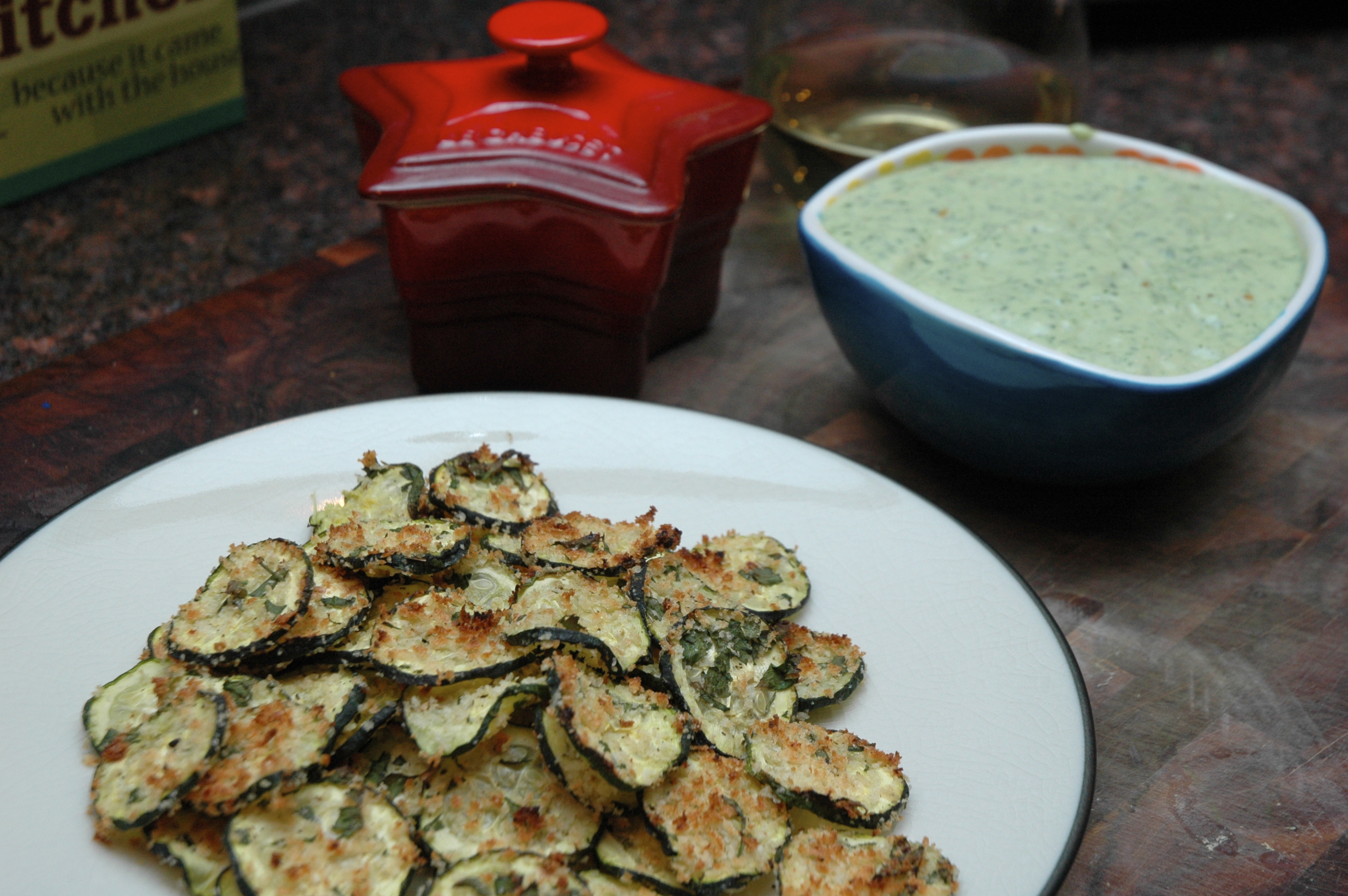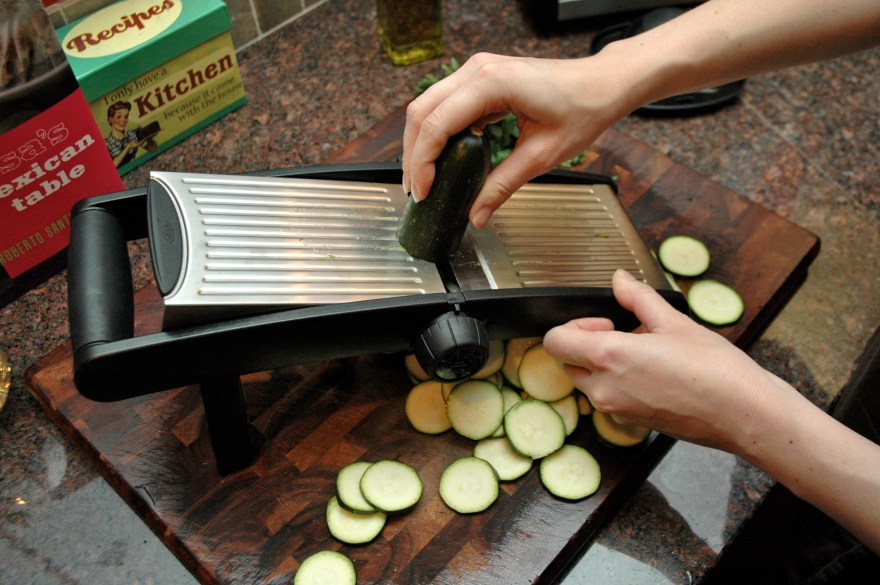 To make the zucchini chips slice the zucchini using a knife and a steady hand or a mandolin.
