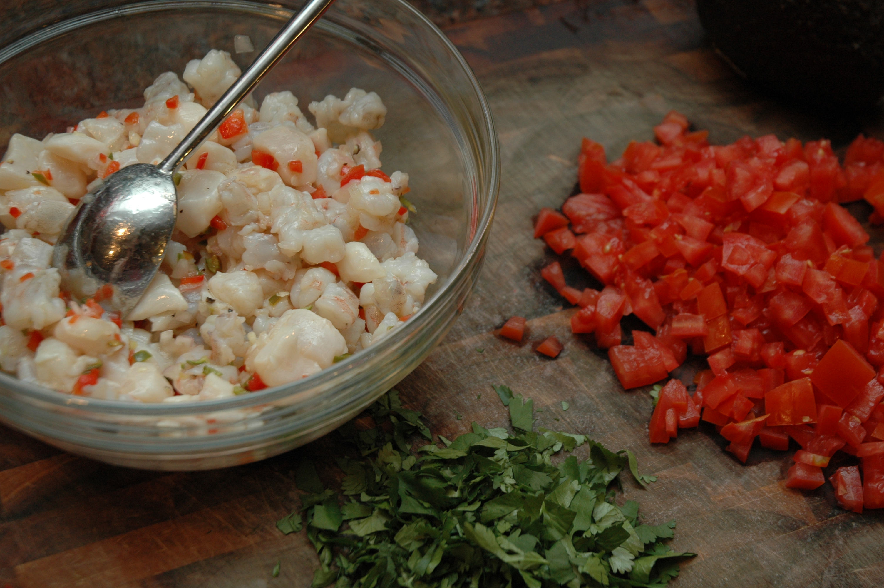 Cover and marinate in the refrigerator for 3-4 hours. The seafood will turn opaque and firm. Using a slotted spoon move the seafood to a clean bowl. Set the liquid to the side and add as you go if needed (I didn’t use any extra).