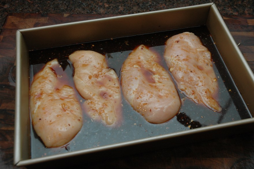 To make the marinade combine the soy sauce and the next 5 ingredients, through the honey, in a medium bowl and whisk until well combined. Trim the chicken of any fat and place in a large baking dish. Pour the marinade over the chicken and refrigerate for 30 minutes to an hour.