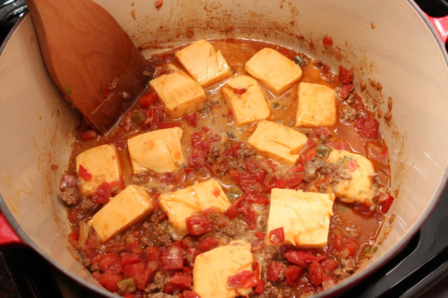 Reduce the heat to medium and stir in the Rotel and cheese.