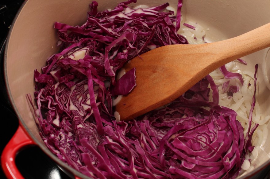Cook for 3-4 minutes until slightly tender. Season with salt and pepper and add the wine. Reduce the heat to medium low and cook until the cabbage is tender, stirring occasionally.